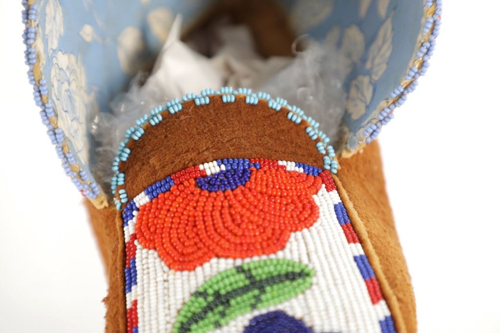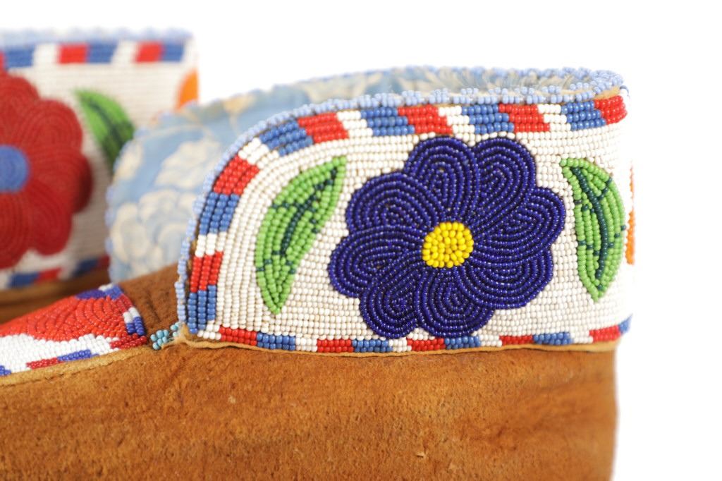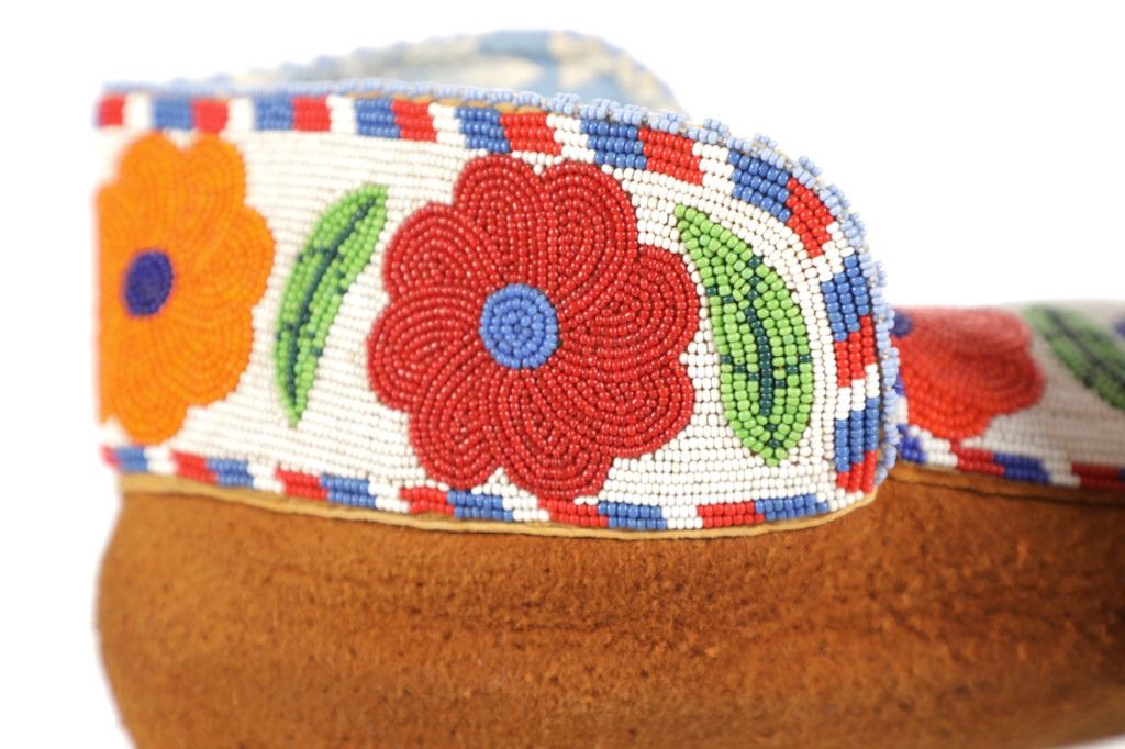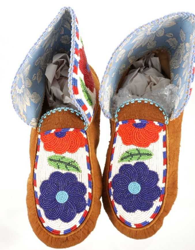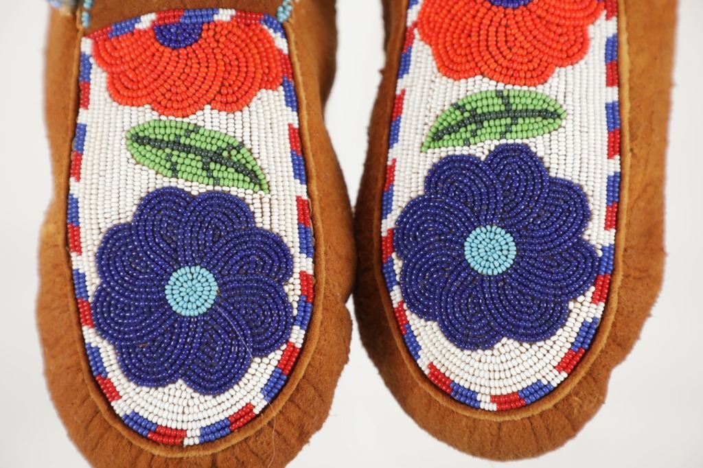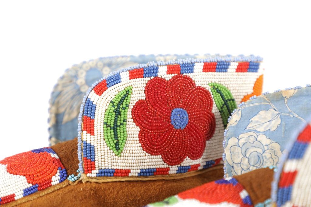 This is a wonderful set of large, men's beaded moose hide moccasins from the Metis Cree of the Canada. The set shows Indian brain-smoked tanned thick Moose hide with calico floral trade clothe, covered foot geometric and floral beadwork and medium height beaded ankle. The beadwork shows nice pony and trade seed glass beads in a geometric and floral pattern, in classic Metis Cree pattern. The set displays beautifully and is from the mid-to-late 20th Century. Provenance: From the Dan Paynich Great Falls, Montana collection. Each measures 11.5"L sole by 5 1/8"W by 5"H ankle. Total weight of 12 oz.