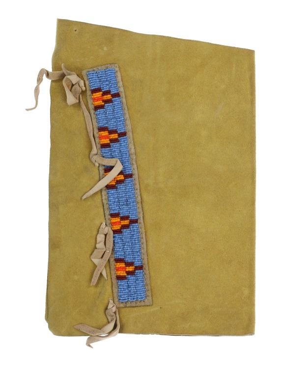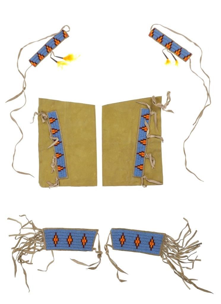 The lot features a dance set from a Northern Plains Sioux child in the 20th Century. This includes beaded hide leggings, beaded hide arm band cuffs and beaded hide bracelet or leg cuffs. These are all matching beadwork with a greasy light blue background and pattern in brown and oranges. The leggings have a yellow painted finish and each have a nice hide fringes. These are all comprised of tanned leather hide and glass beadss with some rolled tin cones and plume feathers. The leggings each measure 12.5" by 8". The arm cuffs are each 26"L with fringes and ties by 3.25" and the bracelets each6.5" by 4" with and additional 40"L of ties.