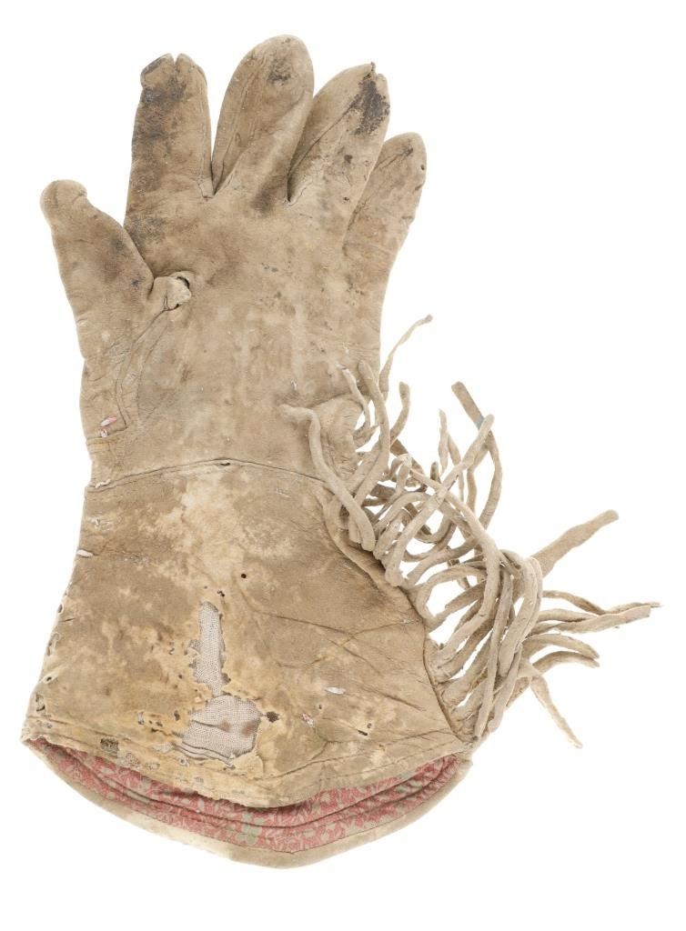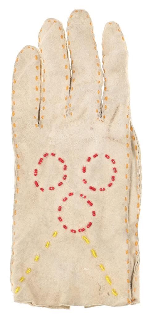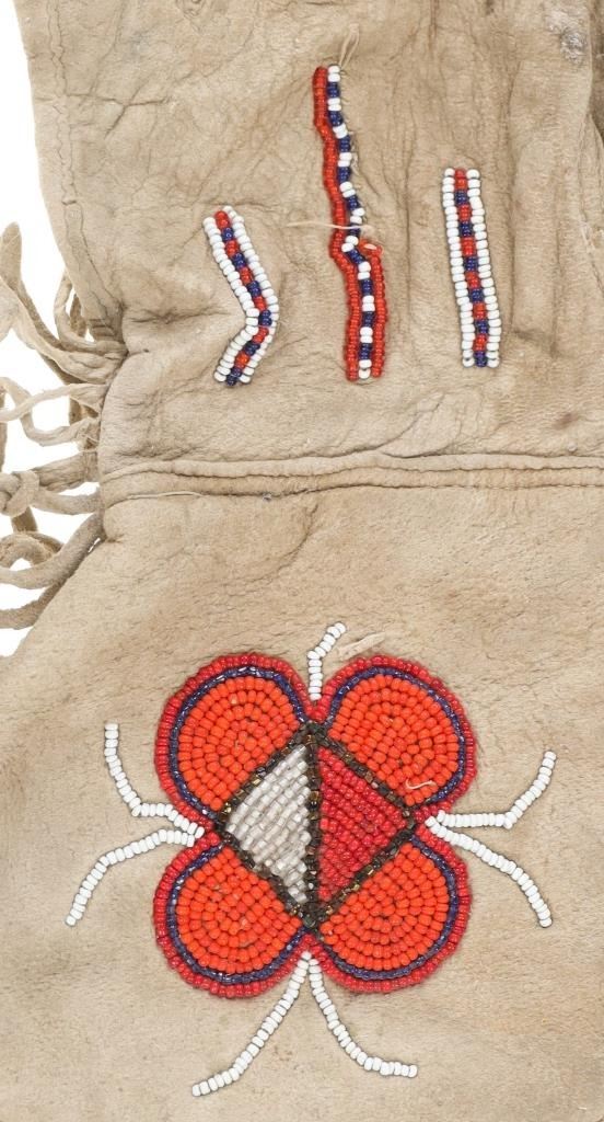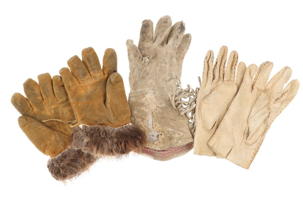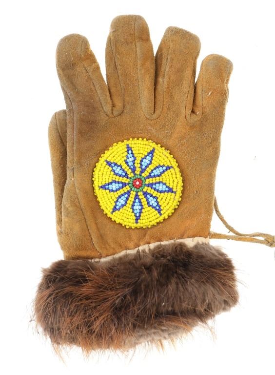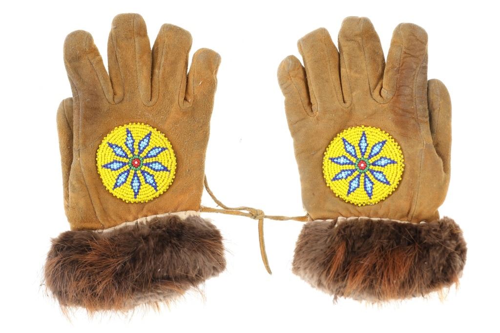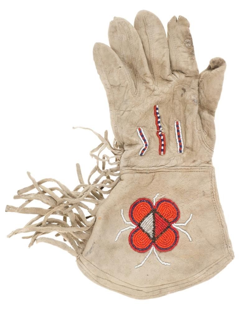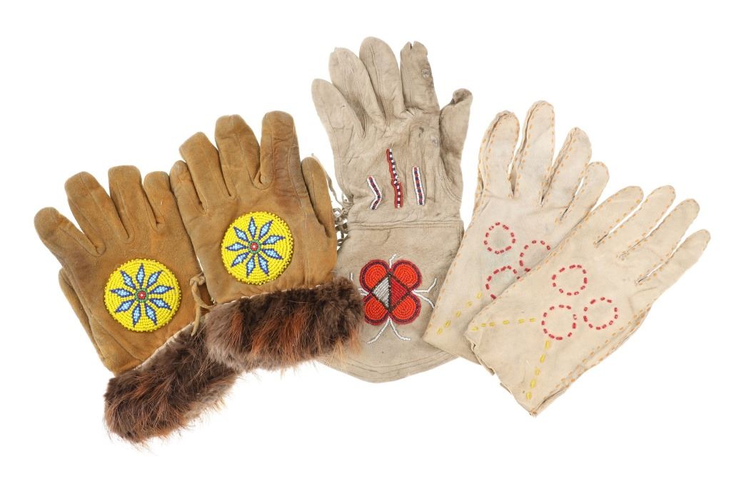 The lot features two sets and one single 20th-century Plains beaded Indian hide gloves. The first is a single gauntlet glove from circa 1930's Crow of Montana made of Indian tanned hide with thread sewing and glass trade seed bead beadwork (shows some loss to the hide, some slight bead loss; 12.5-inches long by 7-inches wide without fringes). The next is a set of Plains Indian tanned hide gloves with yellow thread sewing with beadwork from the early-to-mid 1900's (each measures 9.75-inches by 4-inches. The last set is a Northern Plains likely Cree mid-to-late 1900's gloves showing beadwork medallions with hide gloves and beaver fur cuffs (each measures 9.25-inches by 5.5-inches.