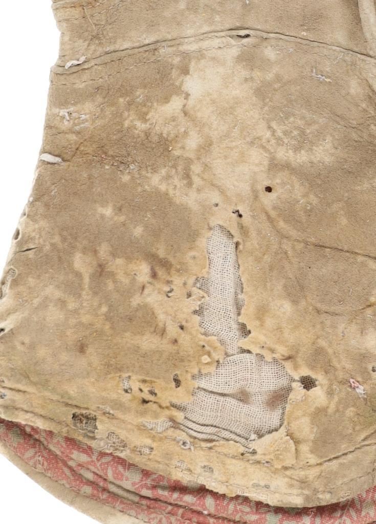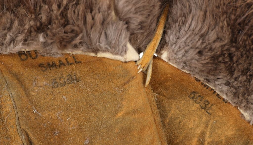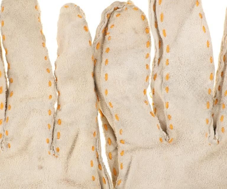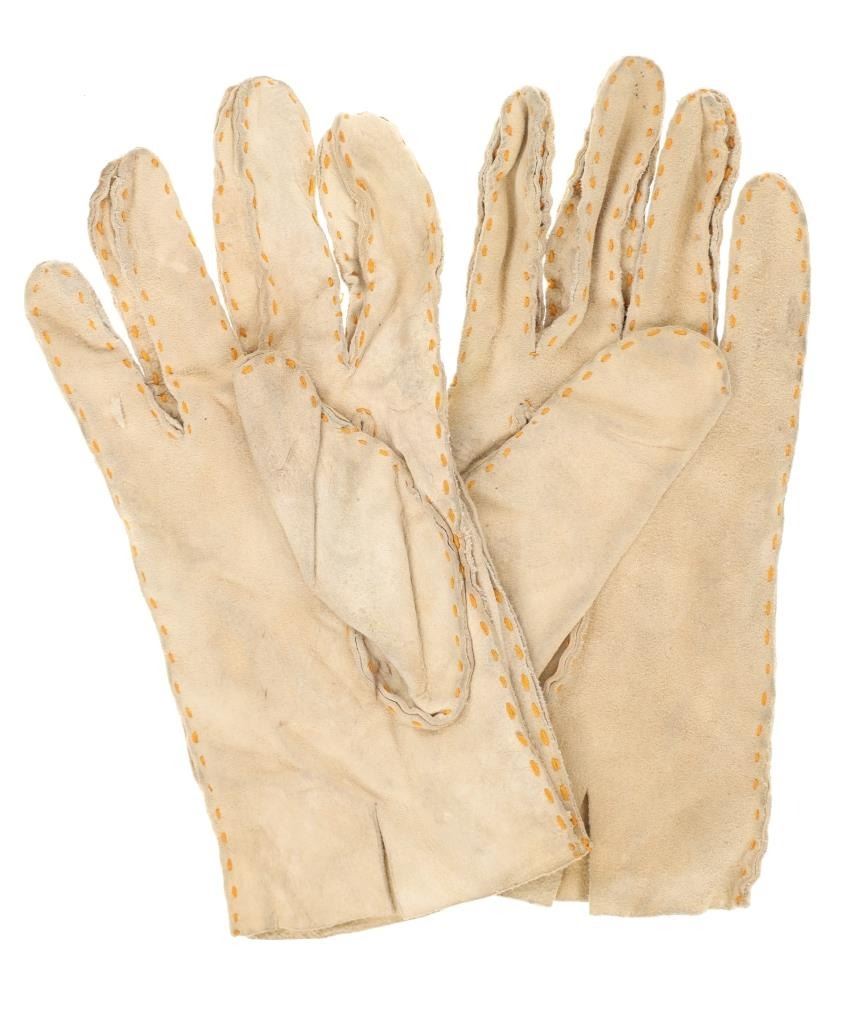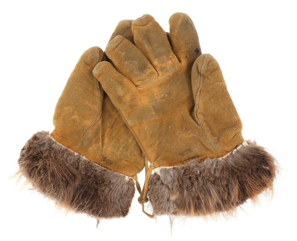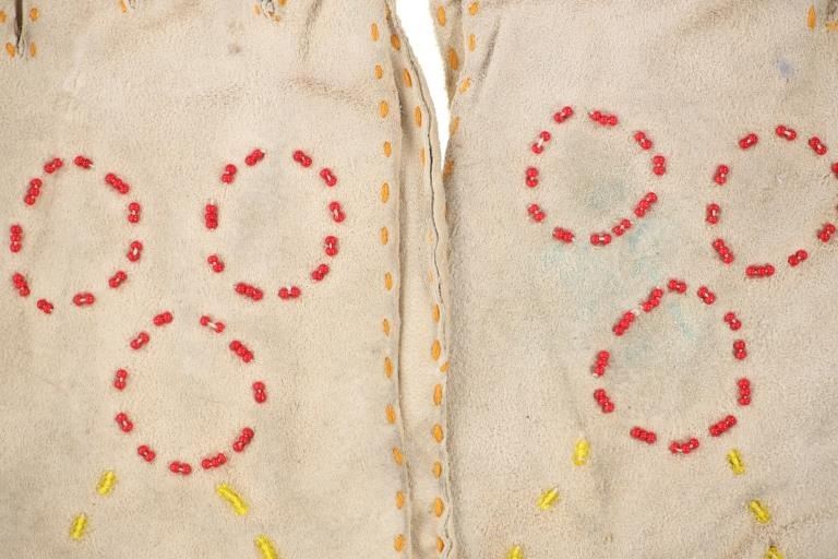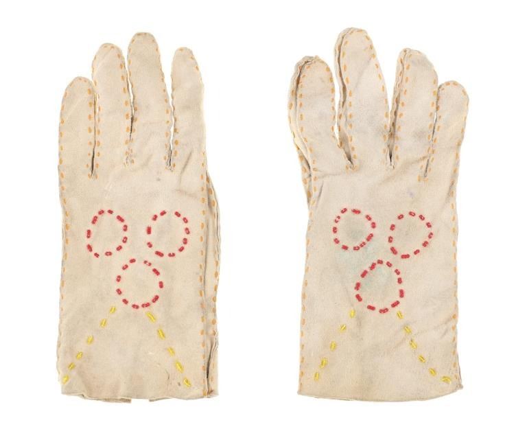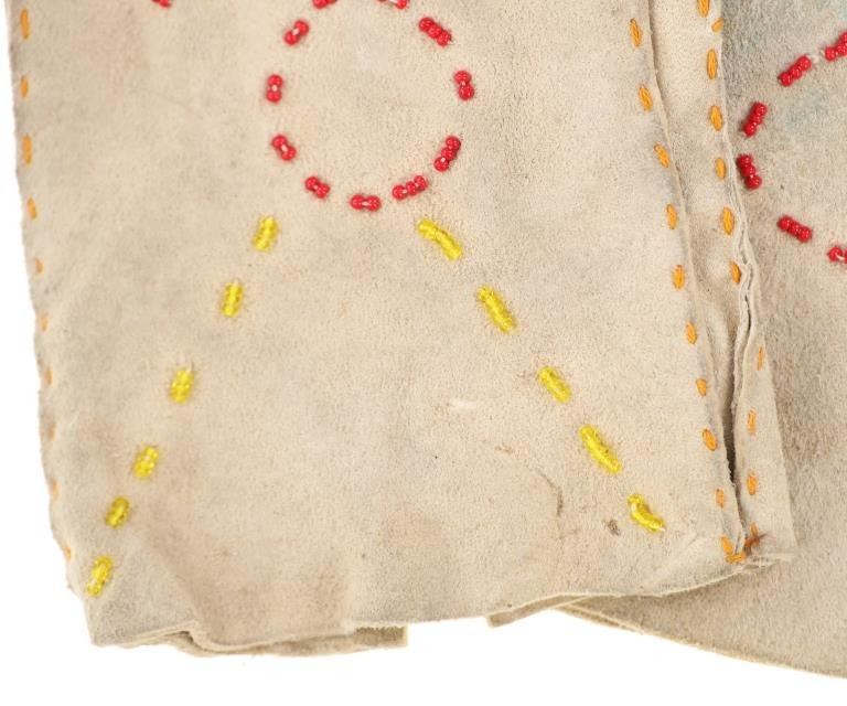 The lot features two sets and one single 20th-century Plains beaded Indian hide gloves. The first is a single gauntlet glove from circa 1930's Crow of Montana made of Indian tanned hide with thread sewing and glass trade seed bead beadwork (shows some loss to the hide, some slight bead loss; 12.5-inches long by 7-inches wide without fringes). The next is a set of Plains Indian tanned hide gloves with yellow thread sewing with beadwork from the early-to-mid 1900's (each measures 9.75-inches by 4-inches. The last set is a Northern Plains likely Cree mid-to-late 1900's gloves showing beadwork medallions with hide gloves and beaver fur cuffs (each measures 9.25-inches by 5.5-inches.