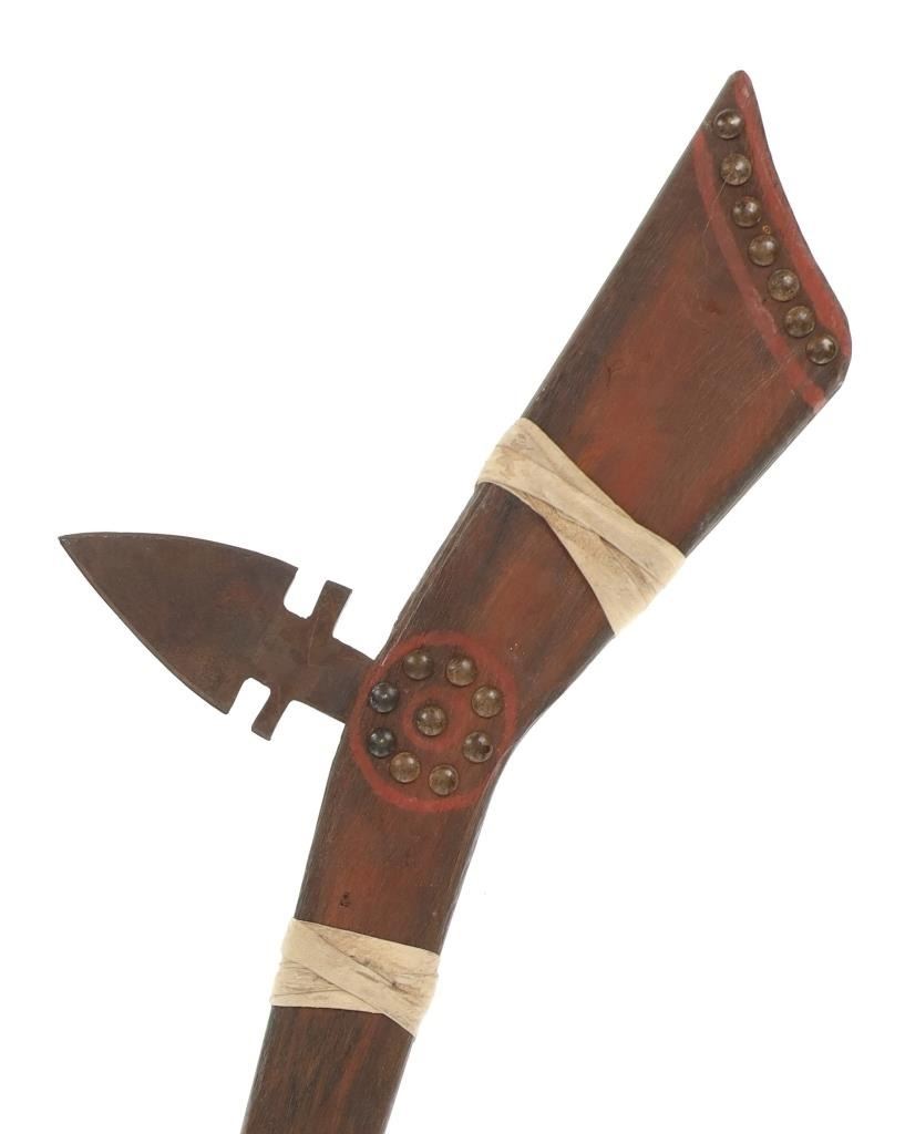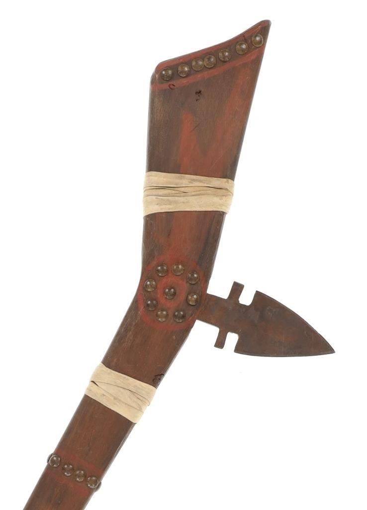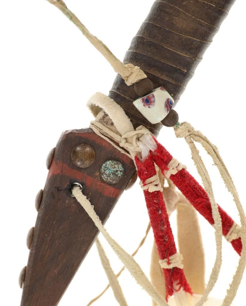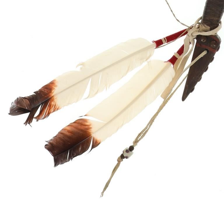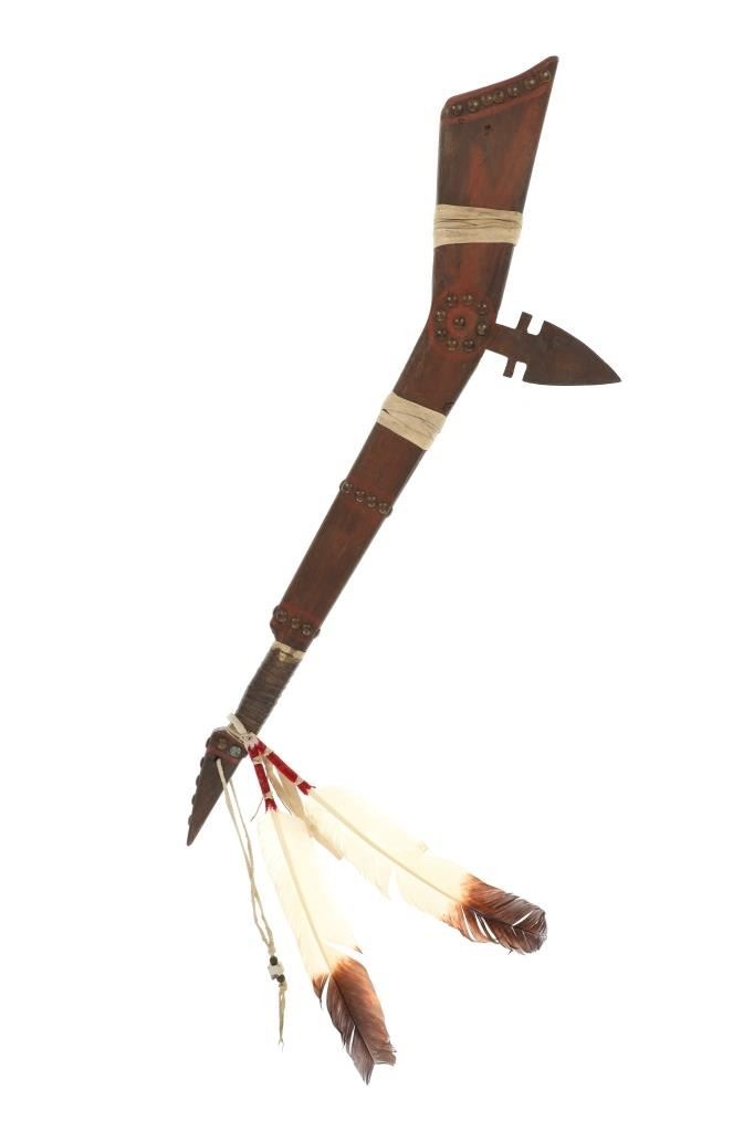 This is a nice, mid-to-late 20th century gunstock club from the Plains with a painted and tacked finish. The club shows a classic gun stock pattern carved from solid heavy dense wood with a metal spontoon shaped blade that is secured with poured lead. The blade is from sheet steel with a notch cut. The club shows bands and circles of brass covered metal tacking with red painted circles and bands as well. The gripping area is wrapped in rawhide with a dark coloring and adorned with Indian hide fringes and Indian hide fringes with red stroud clothe wrapped Turkey feathers. There are also two brass trade beads and an old Venetian trade bead. The club also shows two wraps of parfleche at teh top area. Displays nice. Measures overall excluding the fringes and feathers 30-inches long by 10.5-inches wide, the blade protrudes 4 5/8-inches and is 2 3/8-inches at its widest; the feathers hang an additional 13-inches. TURKEY FEATHERS.