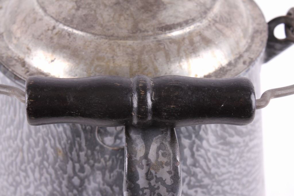 For your consideration is this tin gun metal blue washed contemporary kettle, circa 20th century. This kettle shows a washed gun metal blue decoration in a semi stripe pattern with a hammered attached side handle, a swivel kettle handle, and a turned wooden roller attached. This kettle comes complete with a lid and large sweeping spout. The condition of this kettle is good overall, with some oxidation patina adorning the lid of the tin and inside the kettle itself. The measurements of this kettle are 11" x 8" x 11".