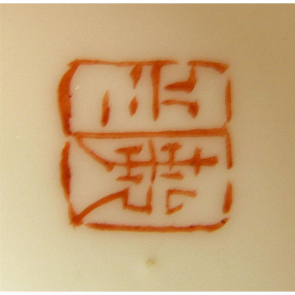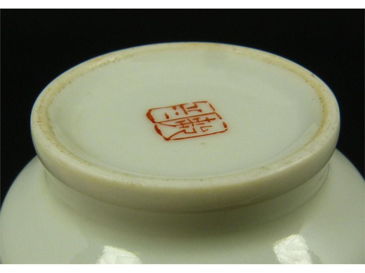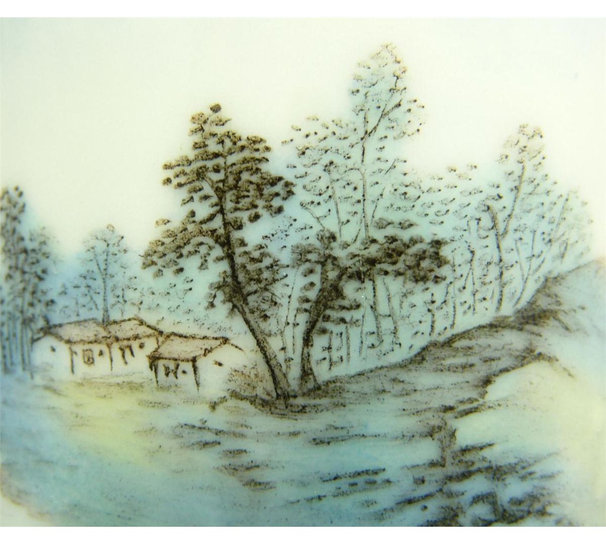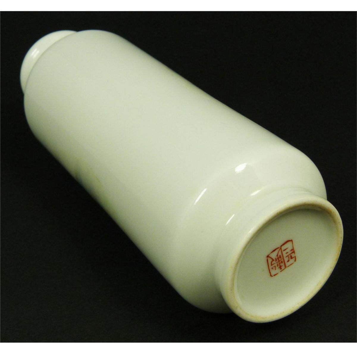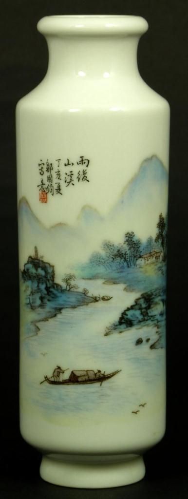 A Chinese hand painted enameled cylindrical form vase depicting a mountainous river landscape scene. Has black calligraphy poem to uppper left of scene with red seal. Holds red calligraphy marks to bottom. Republic to early PROC. Measures 6 1/2" height x 2 1/4" diameter (16.5cm x 5.7cm). Total weight of 199 grams.