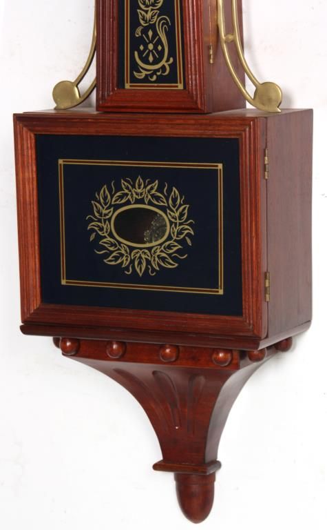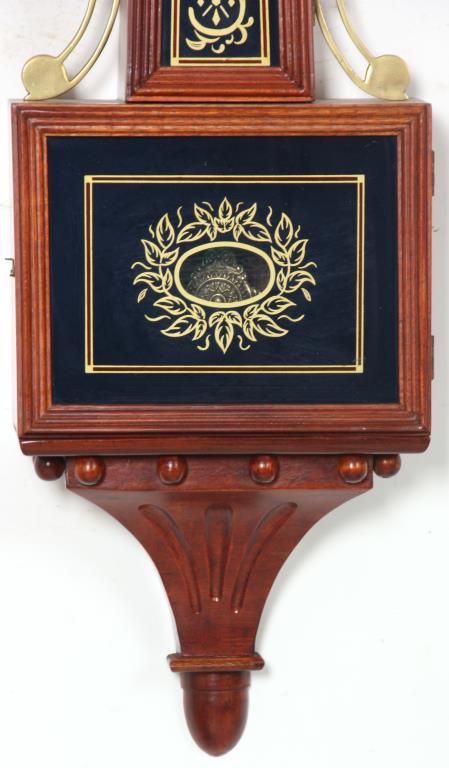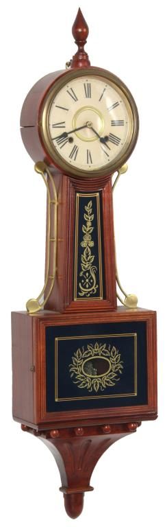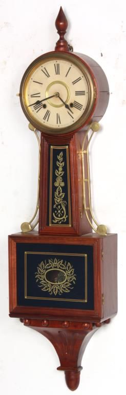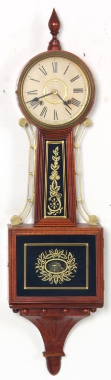 20th Century American Banjo Clock. Original 8 in. paper dial has black spade hands, brass door bezel with glass; brass 8 day spring driven movement has a recoil escapement, hour countwheel strike mechanism on a straight gong, long pendulum rod with brass covered bob and lockdown hardware for pendulum & gong. In a mahogany banjo style case with turned finial, pierced brass side arms, reverse painted throat glass, lower reverse painted door glass and carved and fluted presentation bracket with a border of spherical mounts; in good condition and original finish. 43 in. high x 11 in. wide x 6 in. deep.