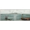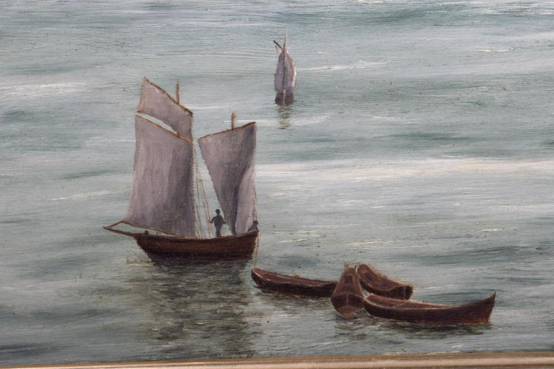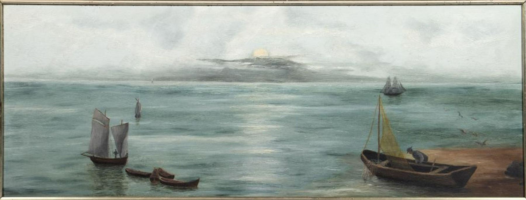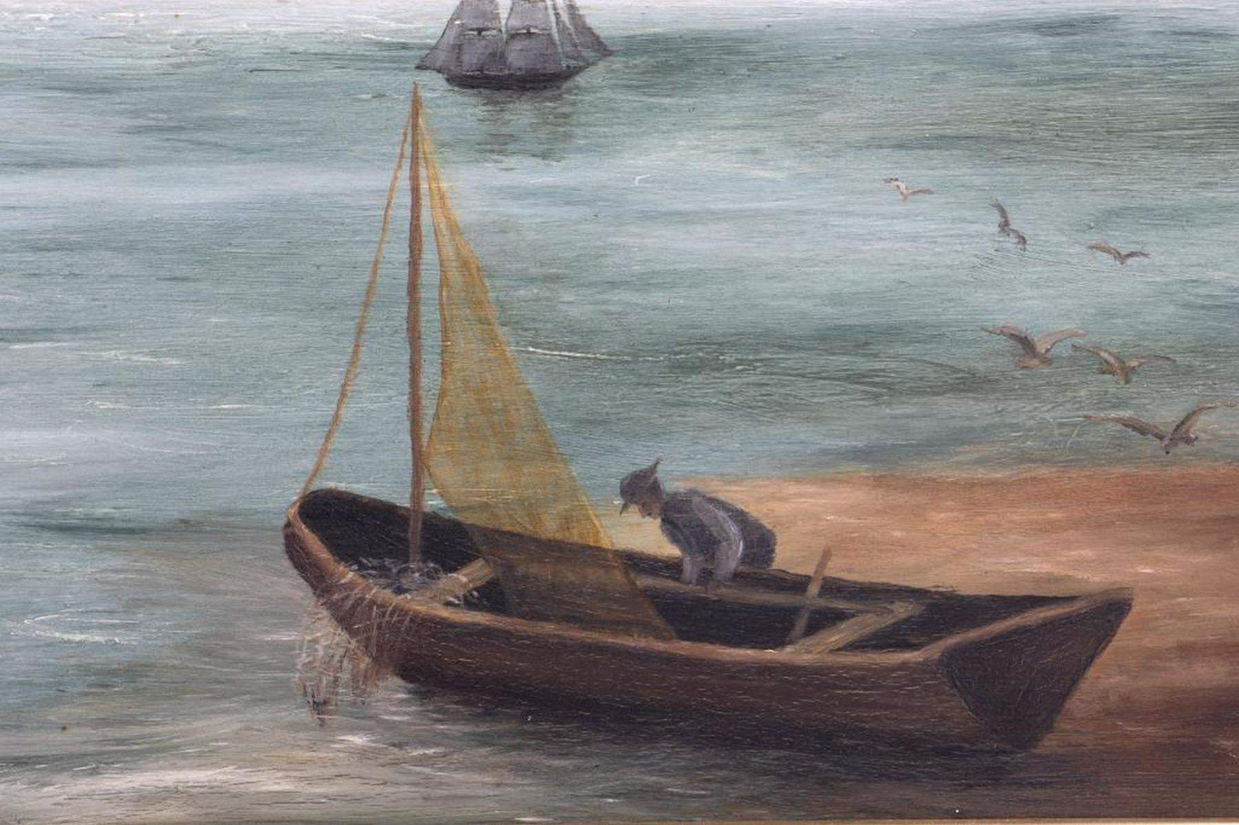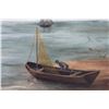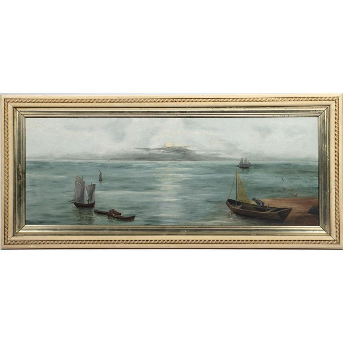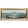 Title: Fishermen and boats. Medium: Oil on panel. Dimension: 9 x 24 in. (image); 13 x 28 in. (frame). Condition: rubs along top edge from frame.