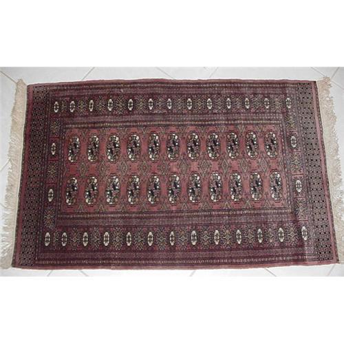 A beautiful mauve bokhara, 58 X 36 1/2" (not including fringe). Medallions of brown and cream outlined in black stand out on the mauve ground. Brown and cream tones alternate on the border. Condition is very good, clean and unworn.