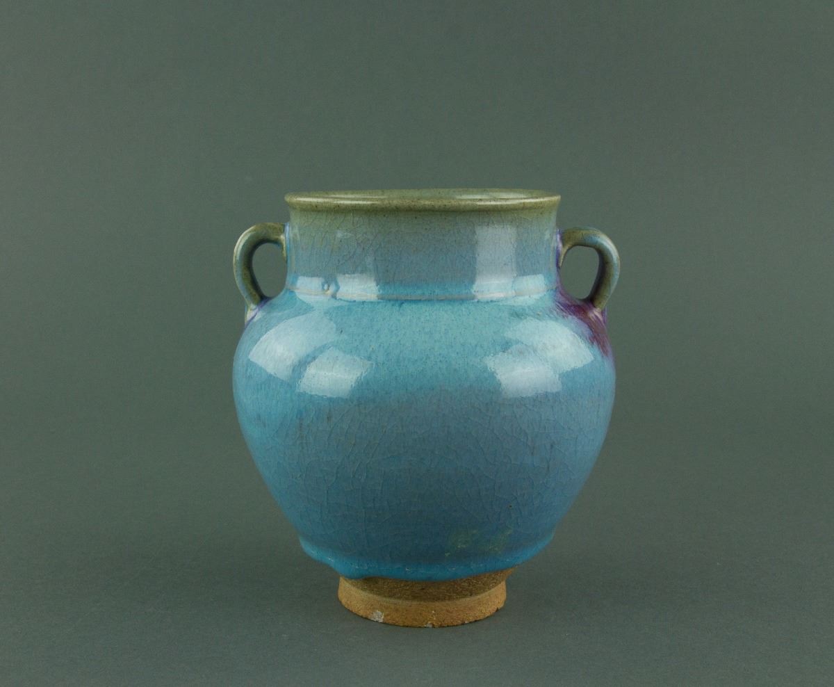 Chinese Junyao style porcelain jar; 20th century; of globular body with a short neck flanked by double loop handles; applied with blue glaze and purple splashes; H: 15 cm, D: 15 cm843 grams