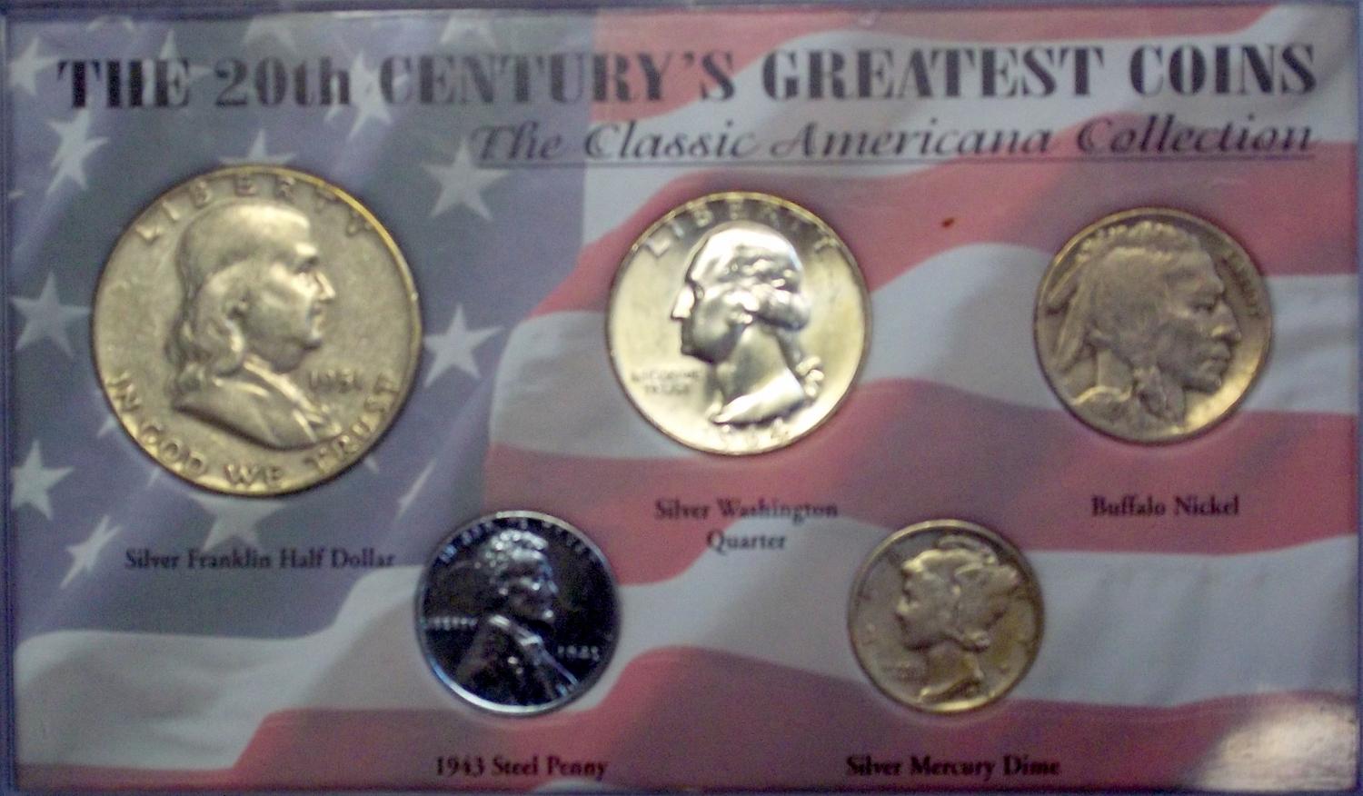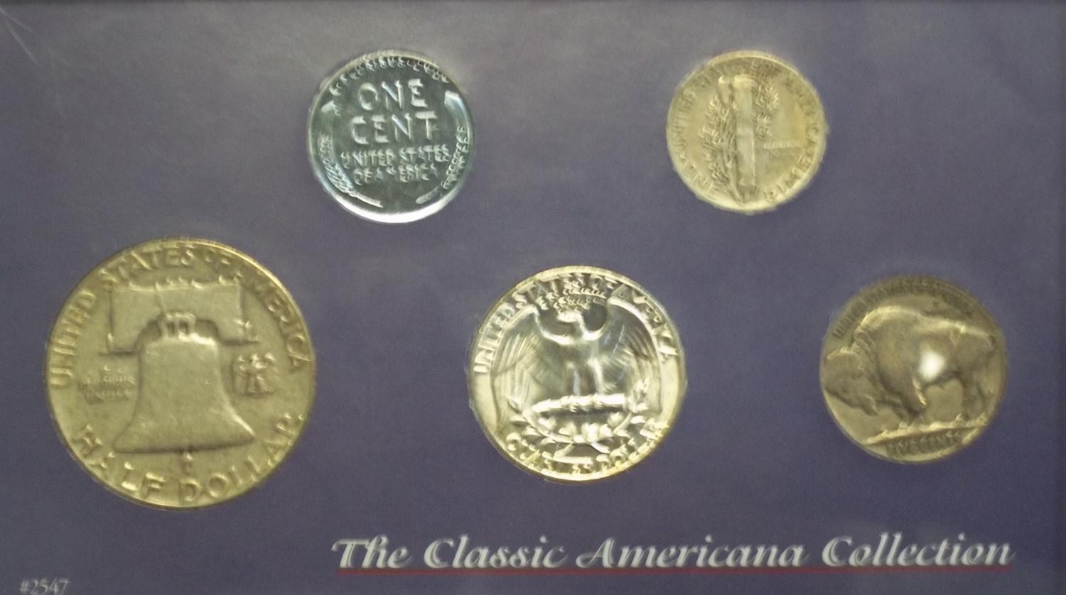 1951 Silver Franklin Half Dollar, 1964 silver Washington Quarter, 1943 Silver Mercury Dime, 1927 Buffalo Nickel, 1943 Steel Penny (uncirculated- rare in this condition).
