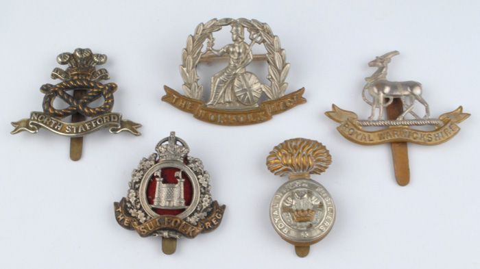 A large collection of British Army badges, including some fine officer's bronze cap badges, mostly dating from the early 20th Century. Regiments include Royal Welch Fusiliers, Worcestershire Regiment, Royal Warwickshire Regiment, South Staffordshire Regiment, Cambridgeshire Regiment, South Wales Borderers, Suffolk Regiment, Norfolk Regiment, Australian Infantry Force, Canadian Expeditionary Force etc. (55 approx.)