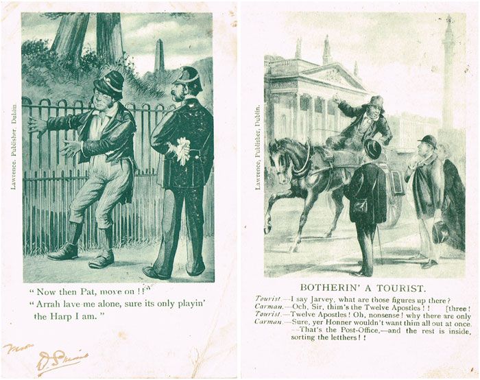 Collection of Irish postcards in a folder, including scenes of Dublin, Wicklow, Kerry, Antrim, Down etc. and humorous postcards including cartoon examples. (72 items)