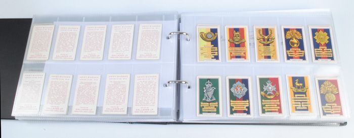 15 complete or nearly complete cigarette card sets. Including German Orders and Decorations, Tony L. Oliver 1963. Railway Working, Player 1927, King's and Queen's of England, Players 1935, Cricketers, Player 1934 and 1938, Famous Jockeys, Gallaher 1936, Irish Industries, Wills 1937 etc. Also 28 flags of the British Empire silks by Kensitas. All contained in a slipcase Guardian Album.