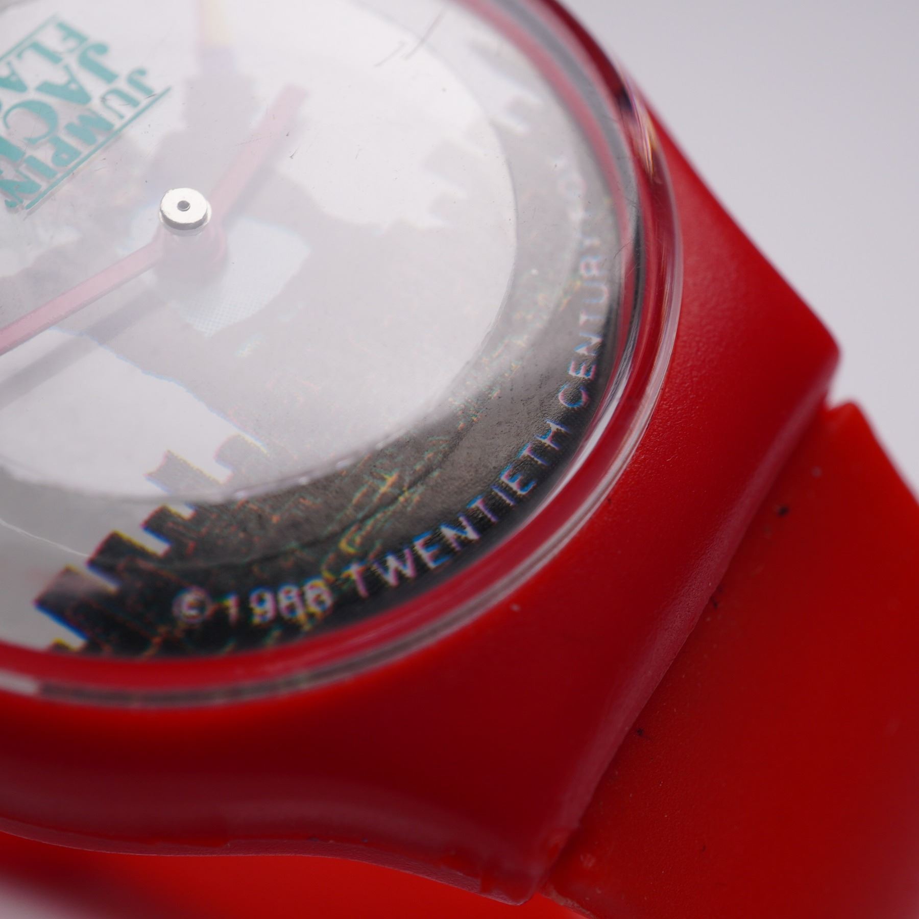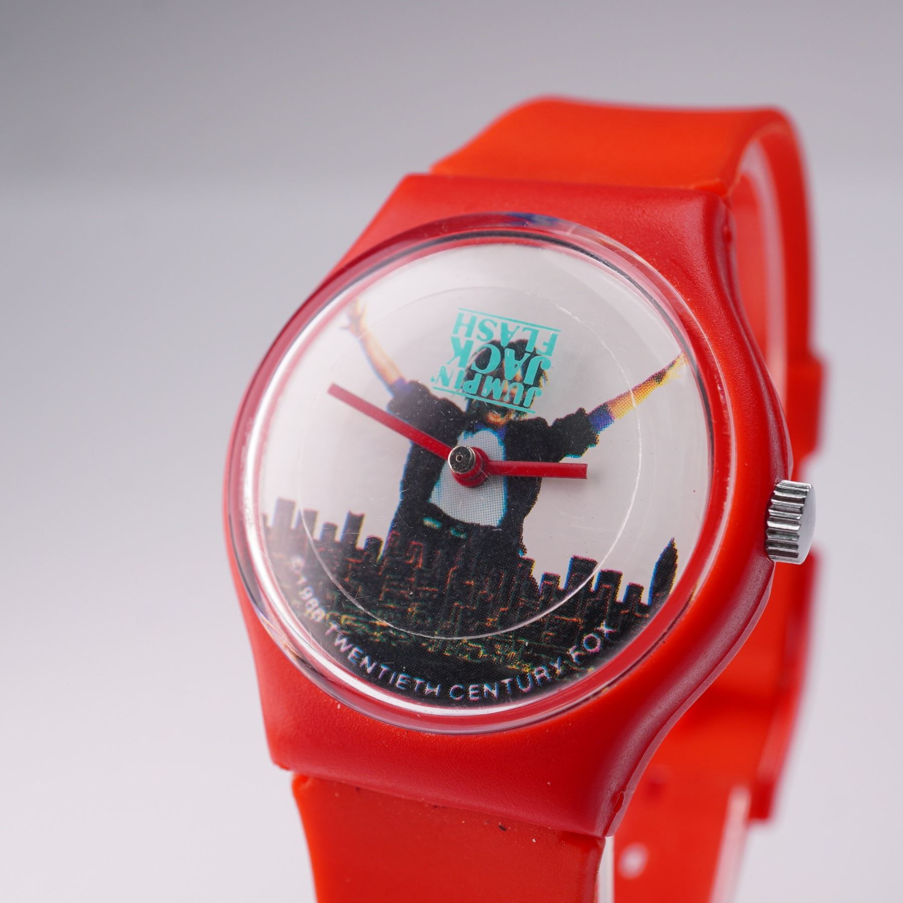 Vintage analog wristwatch produced in 1986 by Twentieth Century Fox to promote the film "Jumpin' Jack Flash," an American spy comedy starring Whoopi Goldberg. The round plastic watch face features a full-color printed image of the film's promotional artwork, depicting the central character jumping against a cityscape background. The design includes the "Jumpin' Jack Flash" logo in teal, positioned upside down across the upper part of the watch dial. The watch's hands are solid red and centered over the figure, maintaining the visual theme. The dial is marked 1986 TWENTIETH CENTURY FOX along the lower edge, confirming its origin and licensing. Housed in a red plastic case with a matching red flexible polyurethane strap and molded buckle. The caseback is sealed and the crown appears metallic. Case diameter (excluding the crown): 31mm. Case thickness: 10mm. Lug-to-lug: 35mm. Strap width: 19mm. Bracelet length: 8.75 in.