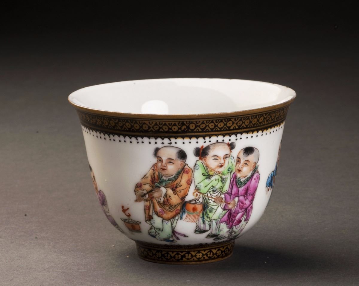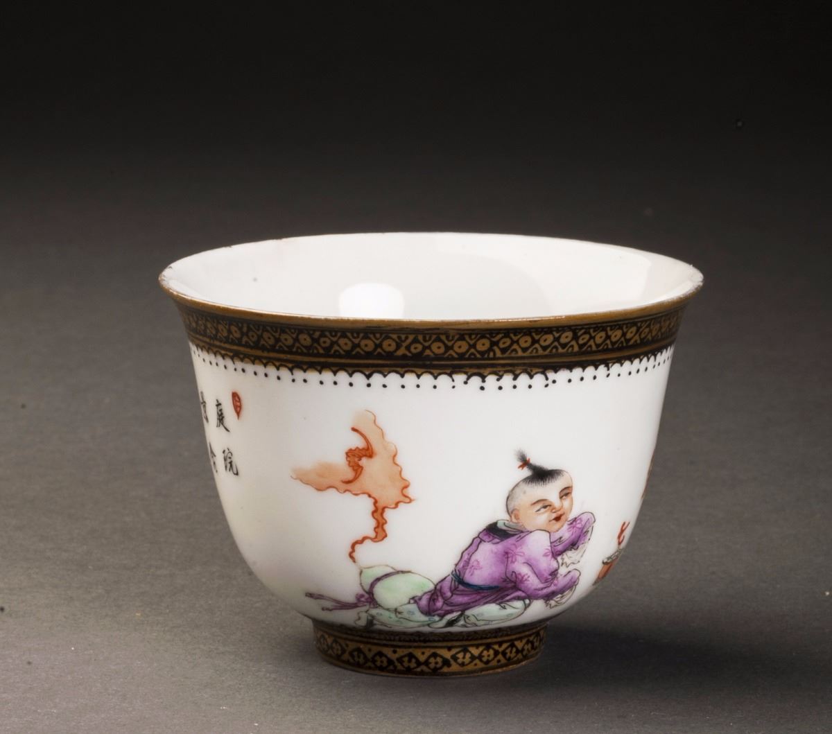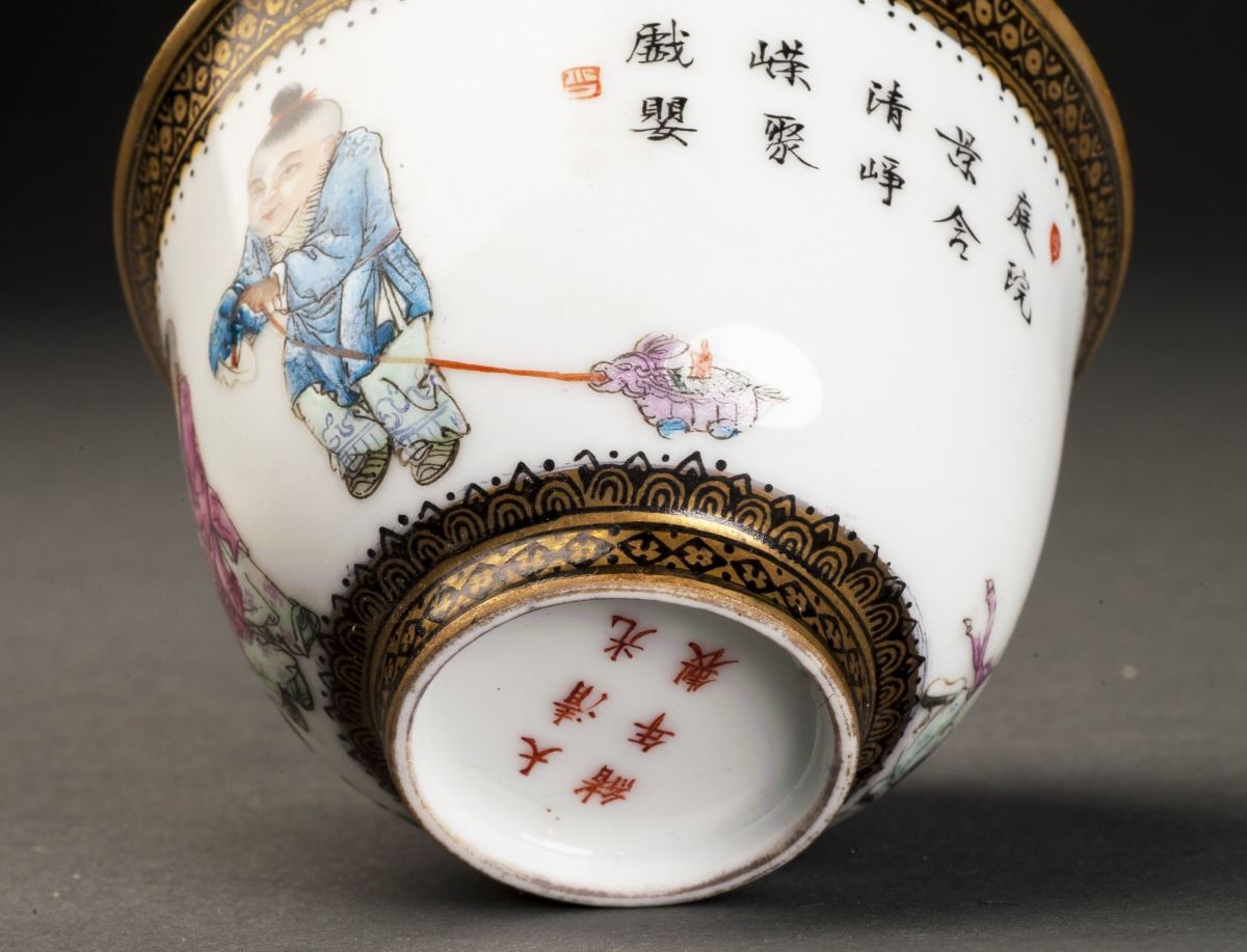 A Fine Enameled Porcelain Cup With Finely Potted Raised To A Flat Foot. Slightly Flared Rim At The Mouth. Five Vivid Little Boys Were Painted On The Main Body. Three Of Them Being Together, The Far One In Blue HoldingSomething In His Hands, And The Other One In Pink Was Looking At Something. With Fine Calligraphy On The Back Of The Bow. With Red Six-character Marks On The Bottom And Of The Period(1875-1908).