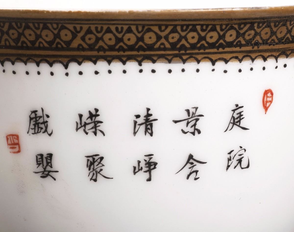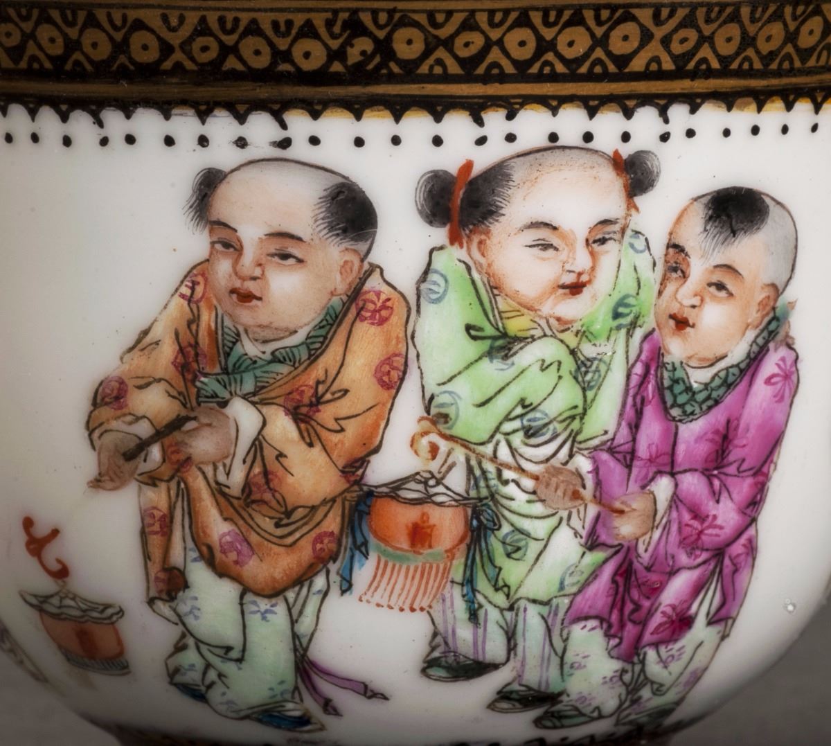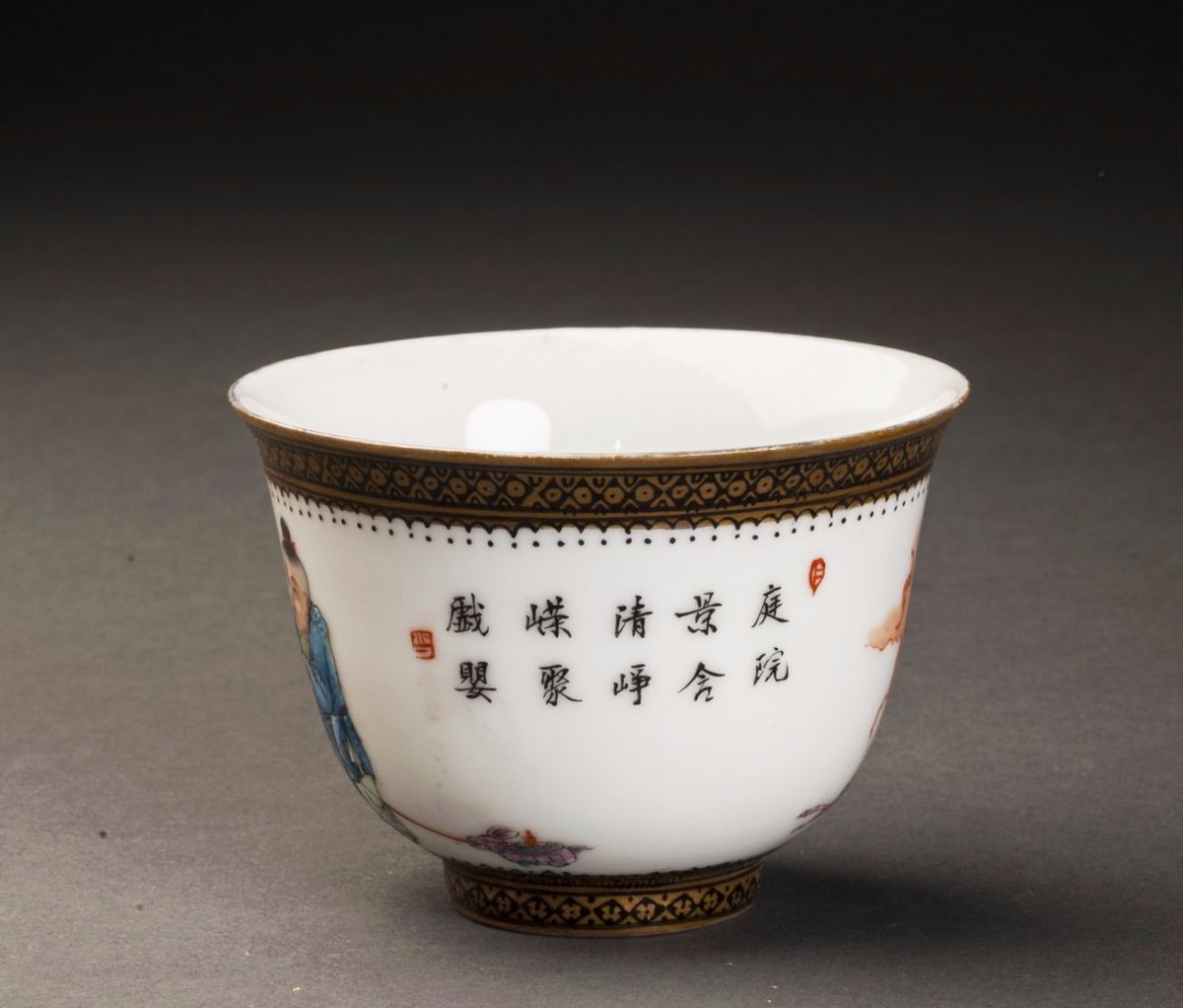 A Fine Enameled Porcelain Cup With Finely Potted Raised To A Flat Foot. Slightly Flared Rim At The Mouth. Five Vivid Little Boys Were Painted On The Main Body. Three Of Them Being Together, The Far One In Blue HoldingSomething In His Hands, And The Other One In Pink Was Looking At Something. With Fine Calligraphy On The Back Of The Bow. With Red Six-character Marks On The Bottom And Of The Period(1875-1908).