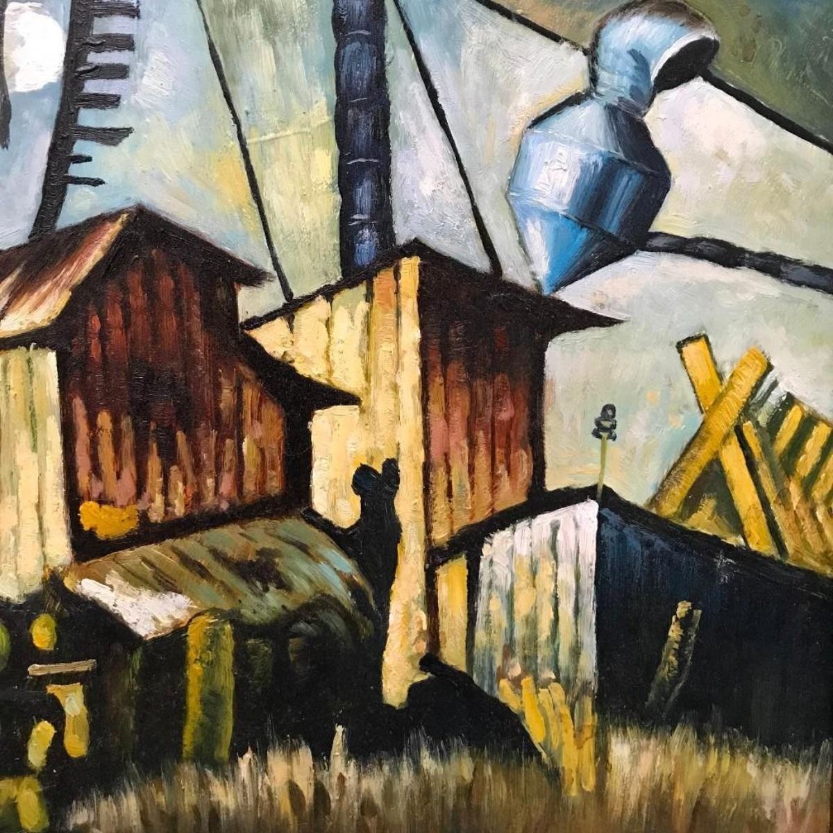 20th century Impressionist oil on board farming scene depicting industrial buildings. Painting 11" X 11". In wood frame, overall 14" X 14".