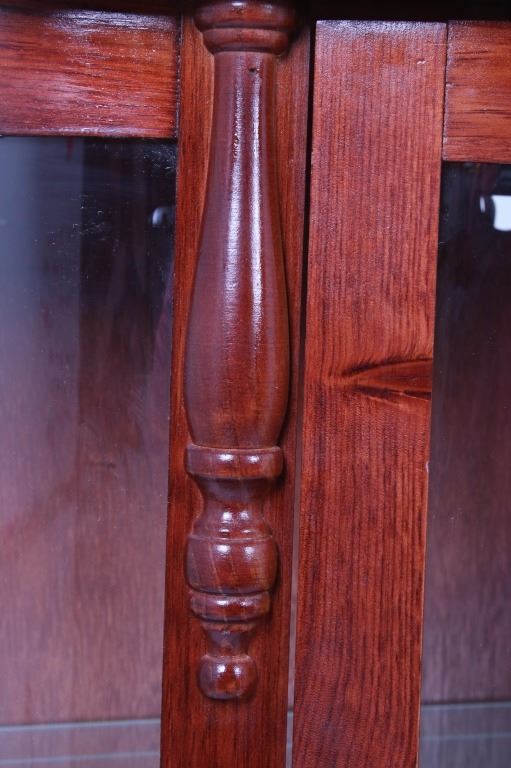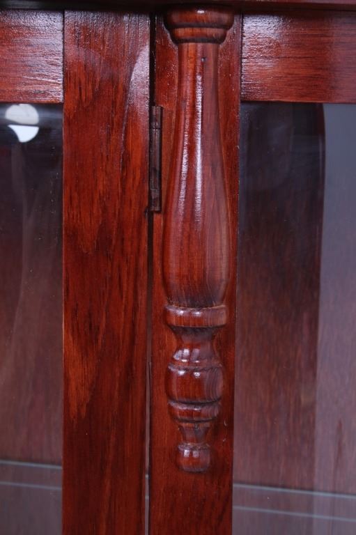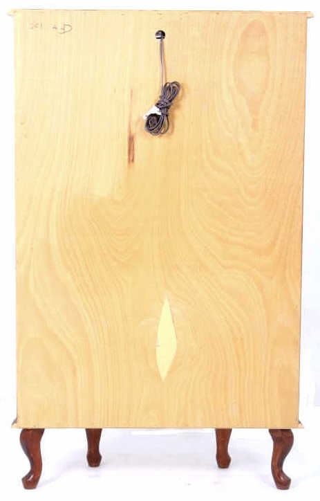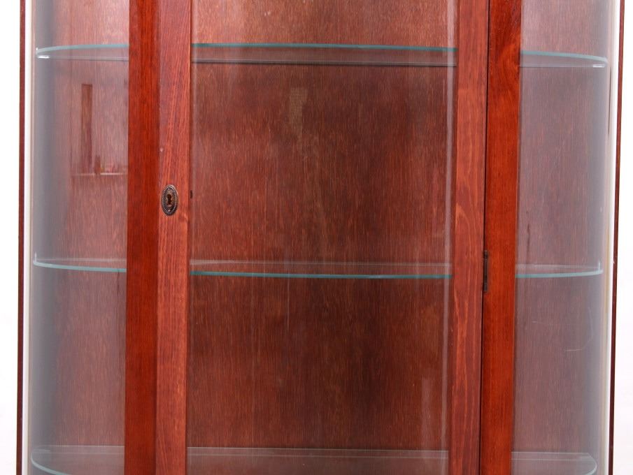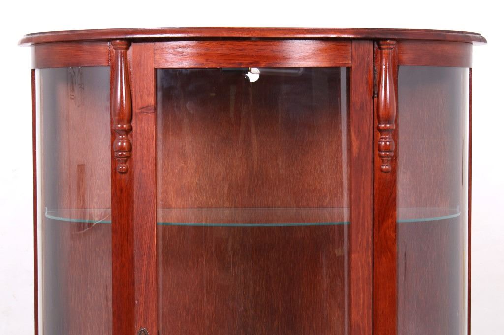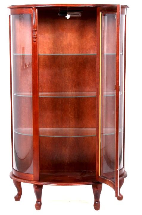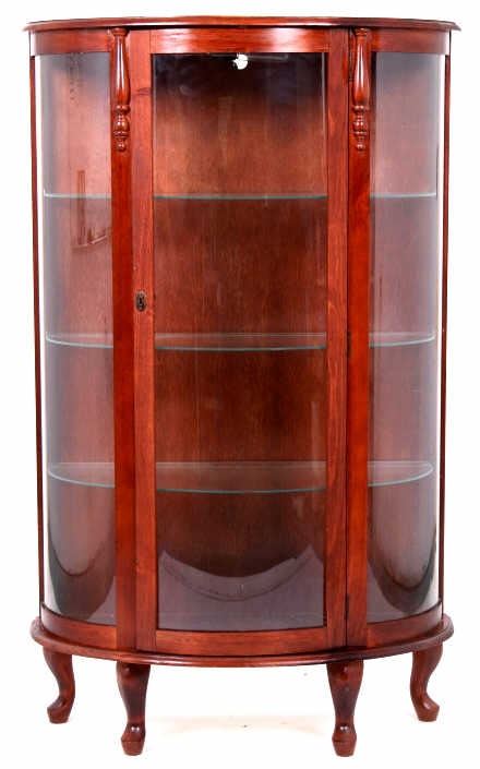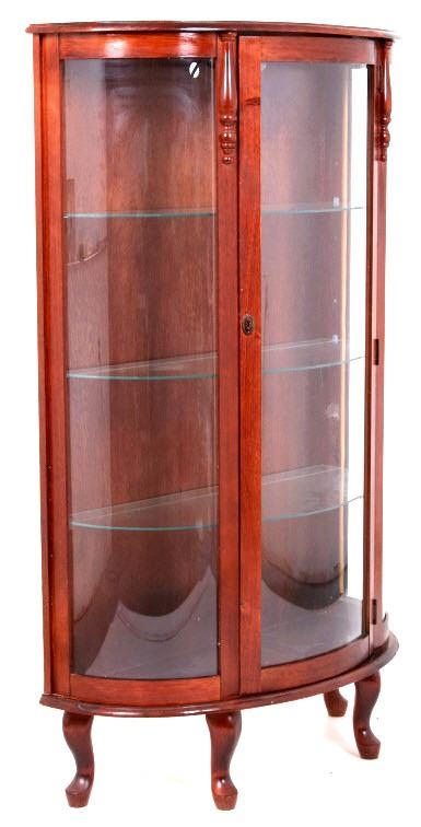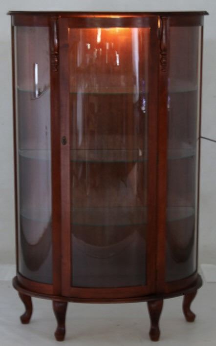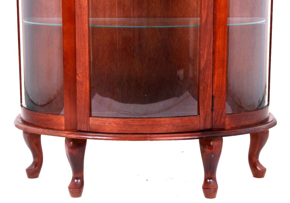 For your consideration in this lot we have a walnut curators display cabinet originating from the 20th century. The piece shows stained walnut frame with glass display windows and glass shelves. The cabinet features solid construction with a front opening door and metal hardware. The cabinet is set on four rounded cabriole legs and shows a plain wooden backing. The piece displays a electric light across the top of the cabinet allowing for easy illumination. Overall the cabinet shows good condition with some light wear due to age. It measures 56 1/2" tall by 35" wide and 14 1/4" deep.