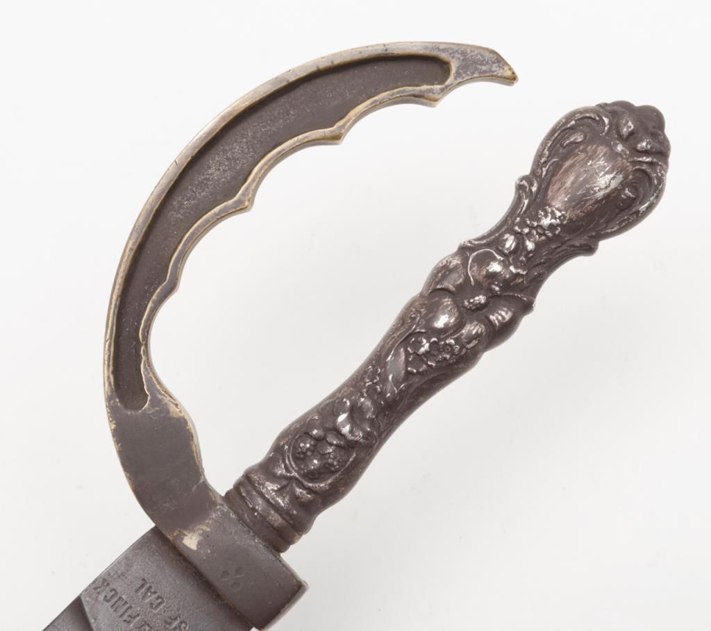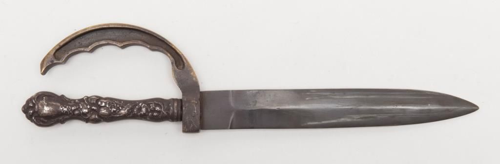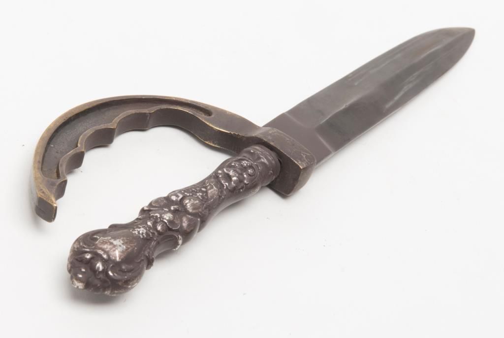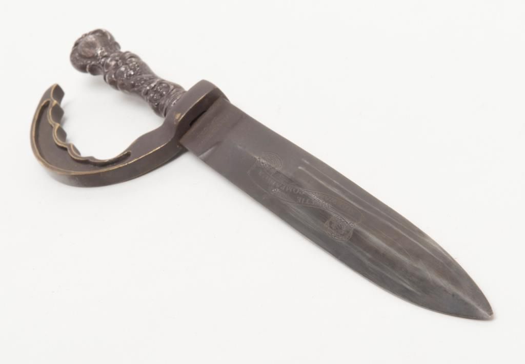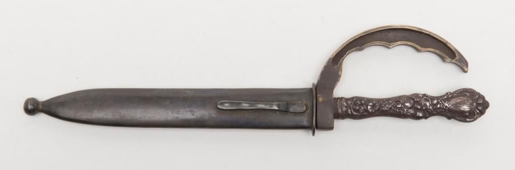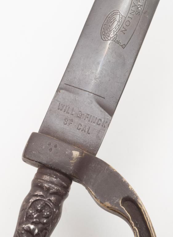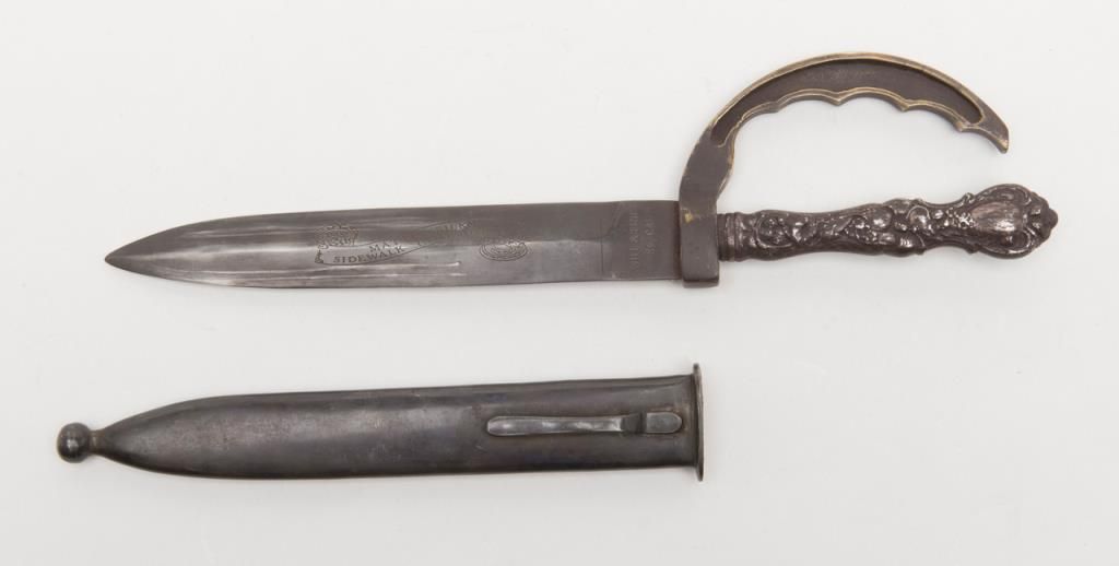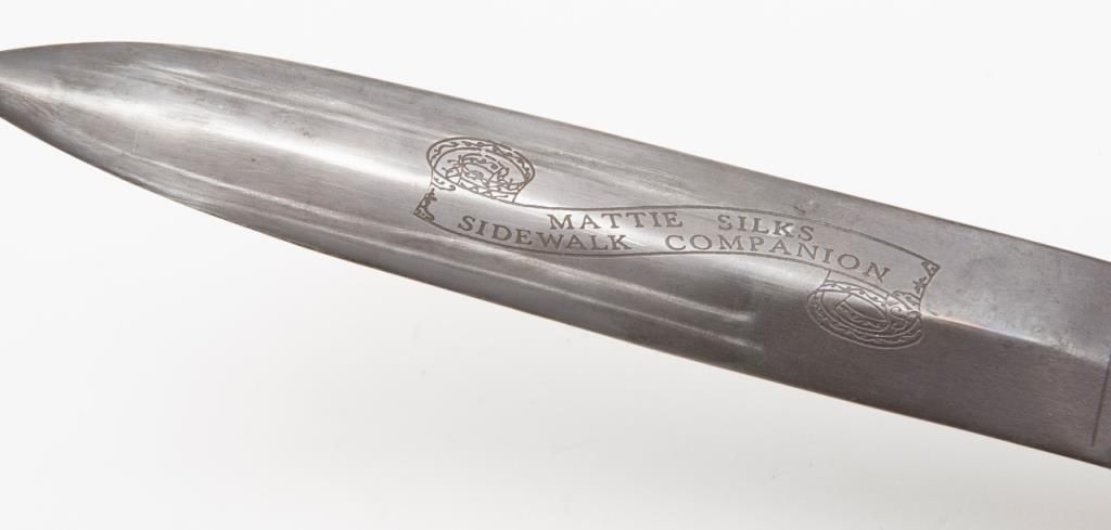 20th Century reproduction of a cutlery handled dagger marked “Mattie Silks Sidewalk Companion” with metal sheath and belt or sash clip, approx. 11: overall with a 7” spear point blade that is also marked “WILL & FINCK, SF CAL”. Est.:$100-$200.