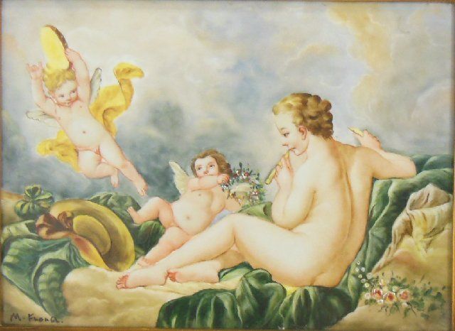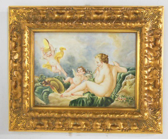 Depicting 'Cupids.' In gold leaf frame. Image approx. 11.5" X 15" W. Framed approx. 20" H. X 23" W.