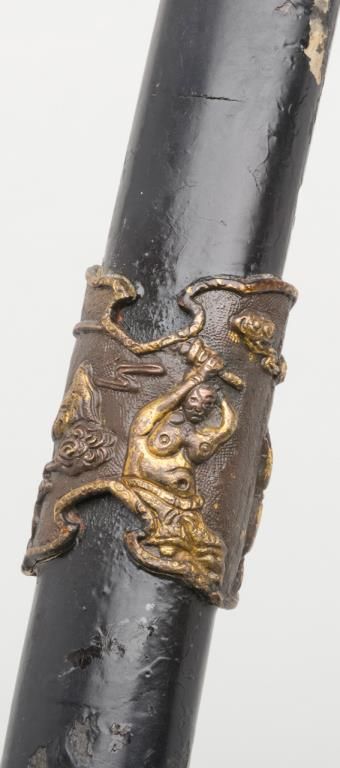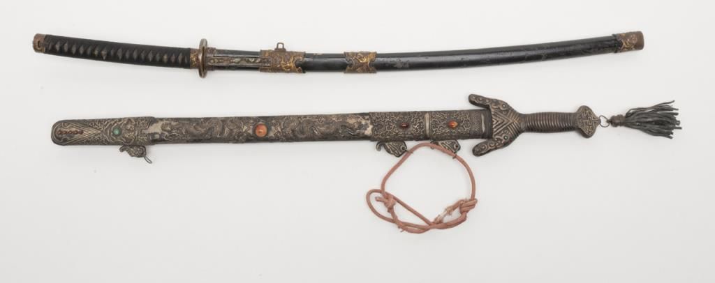 20th-century Chinese sword hammered soft metal scabbard and mounts inlaid with jewels showing an old silver plate and a dark brown pitted blade of an unusual style that we do not believe is Chinese and may have been fitted from an earlier European sword. An attractive decorator. Along with a Chinese made Japanese-style katana with cast brass mounts in fair to good condition showing some age. Est.: $100-$300