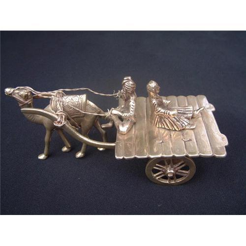 20th. century Indian heavy silver hand-made objet d'art featuring a wheel cart driven by a camel with a male and female occupant. This is a vivid representation of Rajasthan life. The man wears a typical Rajasthan turban, and the woman wears the typical Rajasthani clothing. The silver is hand-chiseled, weighs more than one pound and the carving in silver is rendered at perfection with minuscule details. Dimensions: 7.5" X 3.5" (19 cm. X 9 cm.). Estimated value: $2000.