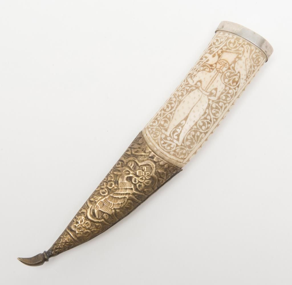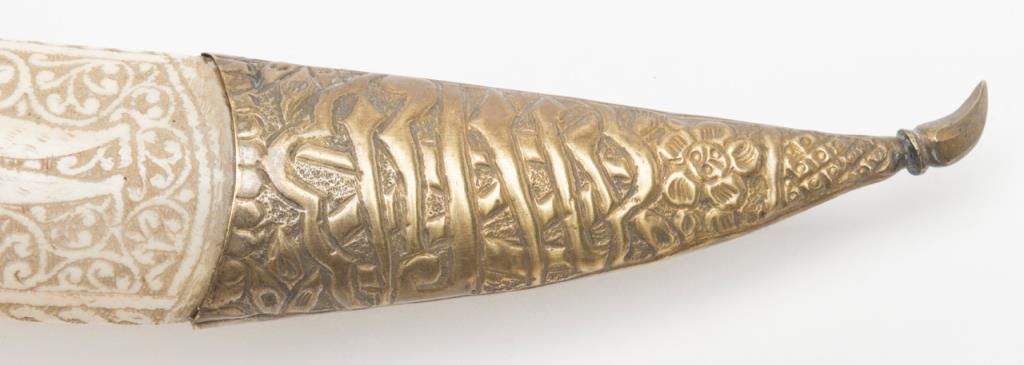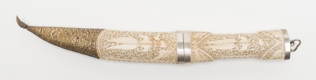 20th century dagger in carved bone body mounted with silver and hammered brass. Simulated damascus (etched blade). Est.: $150-$300.
