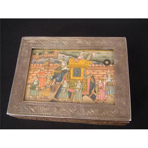 20th. century Indian Mughal silver box with chiseled decorations featuring a floral design. The lid of the silver box features a high quality miniature hand painting illustrating a maharajah riding an elephant with a procession of attendants. Dimensions: 6.2" X 4.8" (16 X 12 cm.). Estimated value: $2500.
