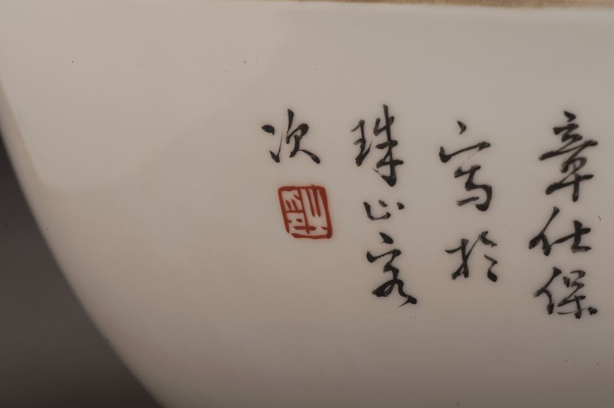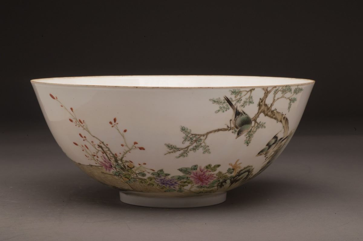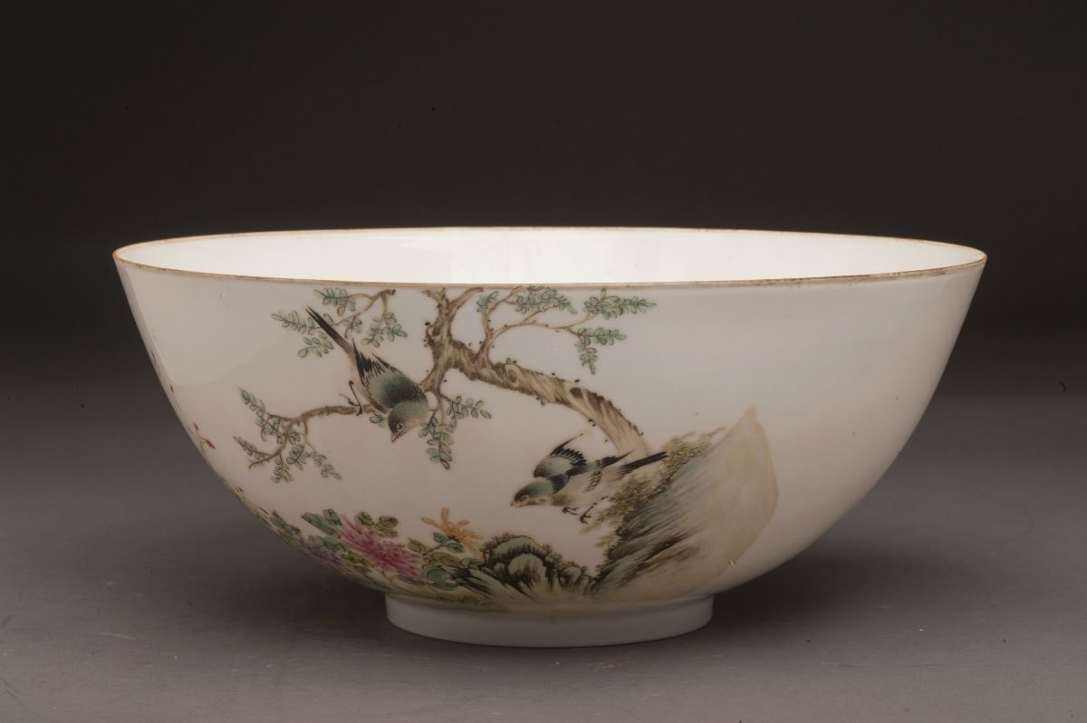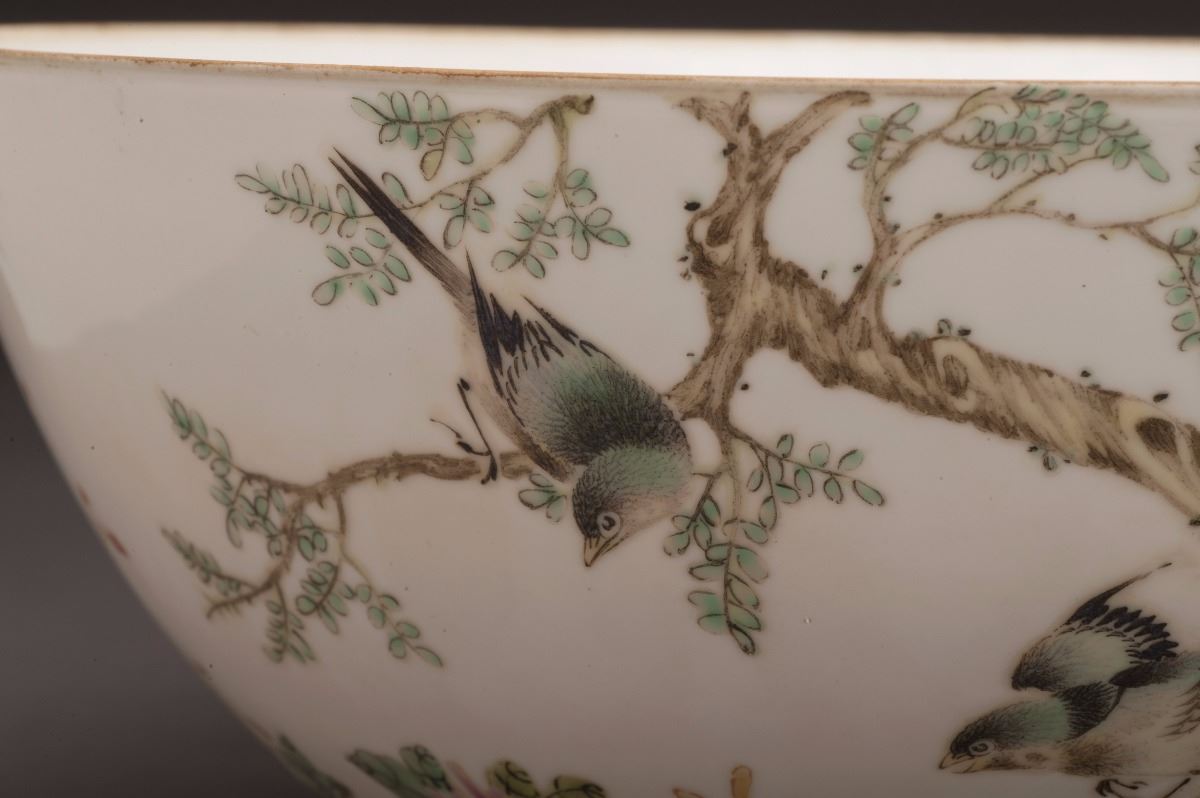 This fine and rare porcelain bowl with vividly depicted birds standing on the top of branch. All set within the landscaping and blooming flowers and rocks. With fine calligraphy on the other side. Gilt mouldedat rim.