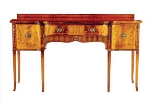 20th century Adam-style mahogany sideboard. Shaped top over case with fluting & acanthus leaf accents, center drawer flanked by two doors, on tapered legs. 37 1/2"H X 68"W X 24"D.