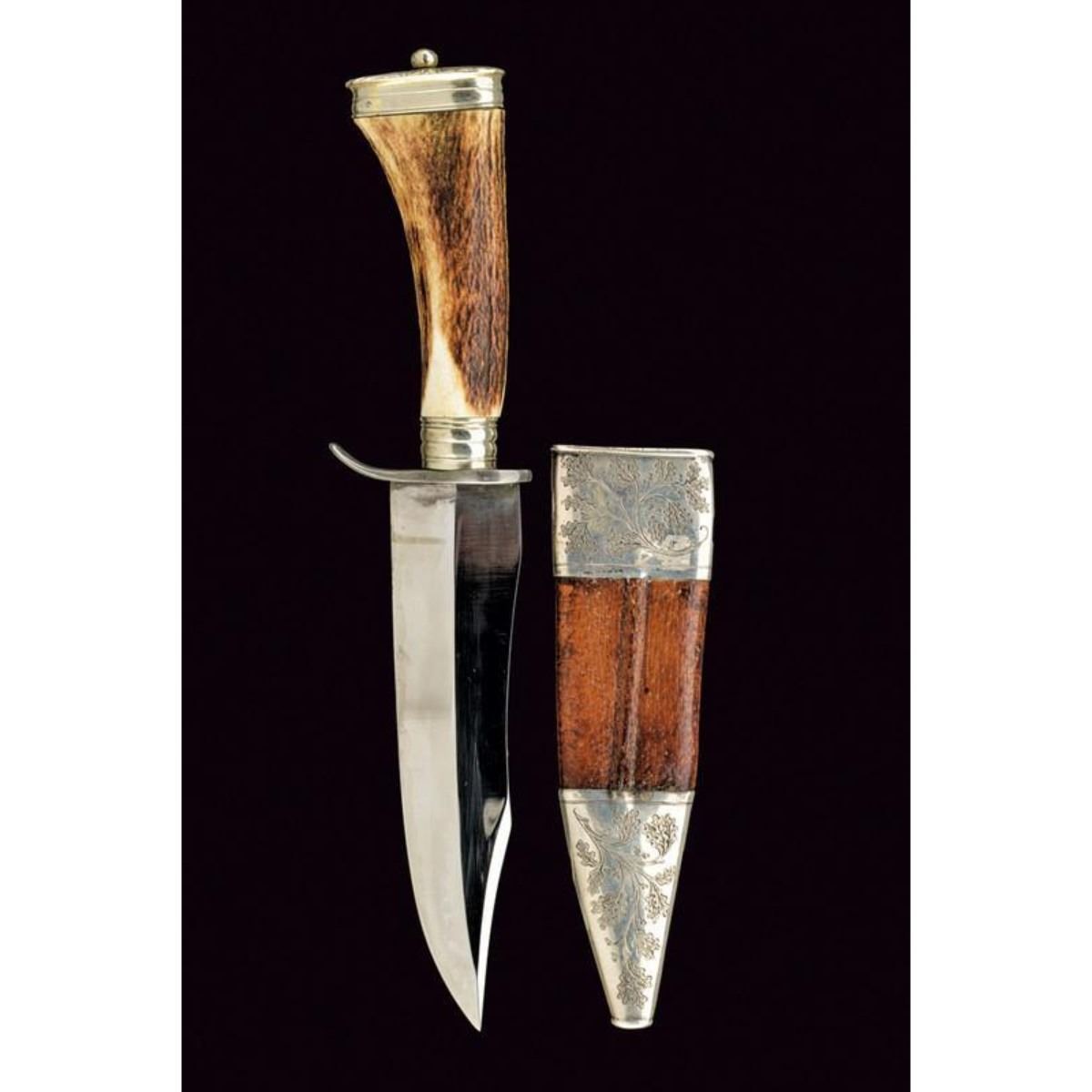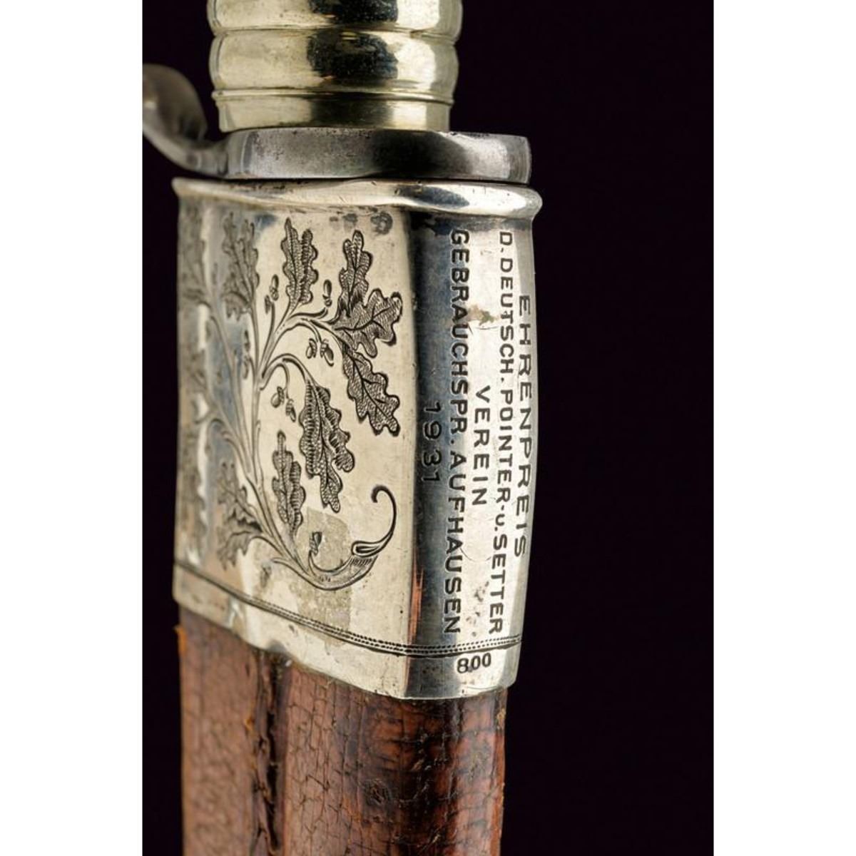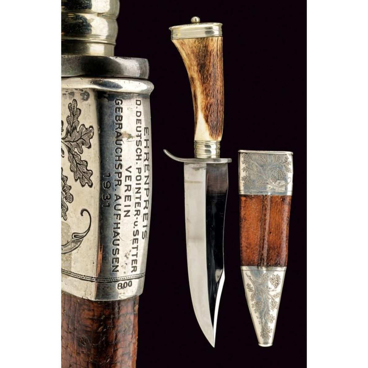 Austrian hunting knife with wide blade slightly curved to a thread, marked "J. FOLLARE WIEN"; handle in deer horn with silver fittings; leather sheath with silver fittings finely engraved with oak leaves, bearing the inscription "EHRENPREIS D. DEUTSCH POINTER-U. SETTERVEREIN GEBRAUCHSPR. AUFHAUSEN 1931", and stamp "800". Second quarter of the 20th century. 11" L ( 28.5 cm ). 10110-040518-CZ-00498