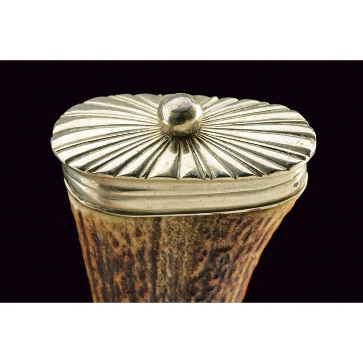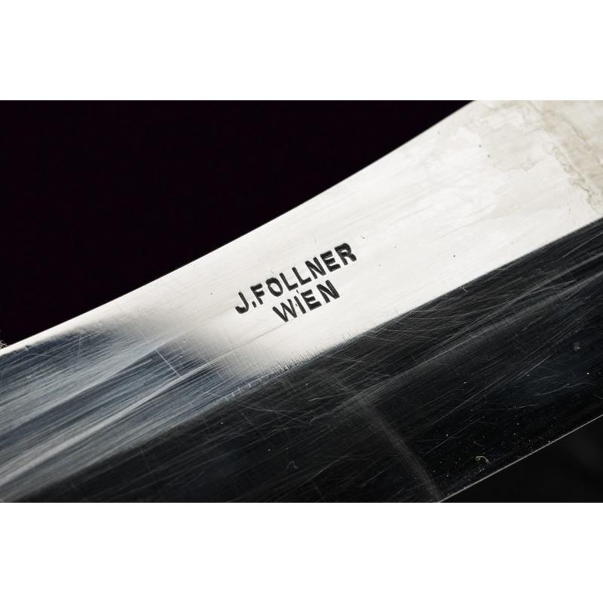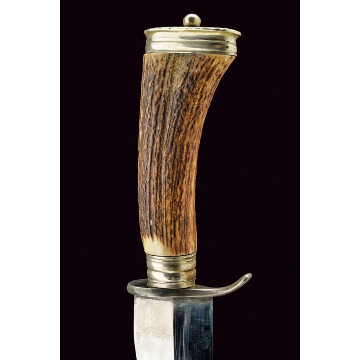 Austrian hunting knife with wide blade slightly curved to a thread, marked "J. FOLLARE WIEN"; handle in deer horn with silver fittings; leather sheath with silver fittings finely engraved with oak leaves, bearing the inscription "EHRENPREIS D. DEUTSCH POINTER-U. SETTERVEREIN GEBRAUCHSPR. AUFHAUSEN 1931", and stamp "800". Second quarter of the 20th century. 11" L ( 28.5 cm ). 10110-040518-CZ-00498