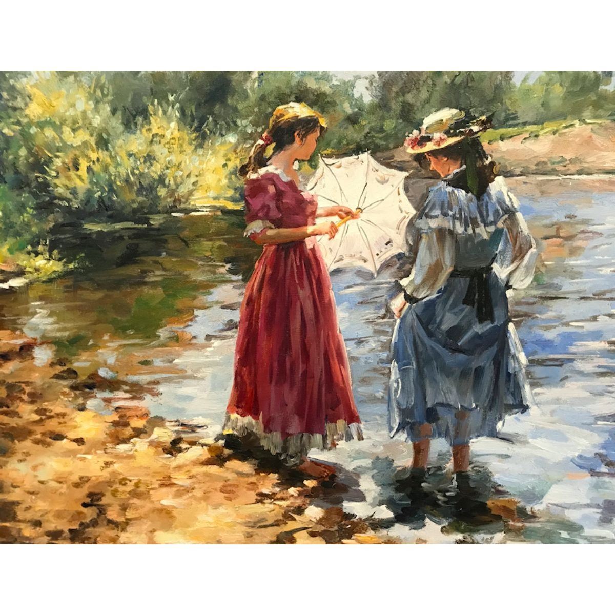 20th Century Impressionism, oil on canvas painting of two young ladies standing at water's edge of a pond or river. 23 1/2" X 31 1/2".Â