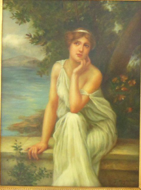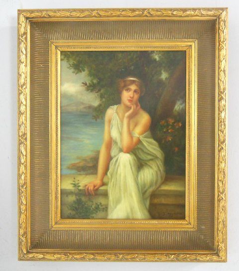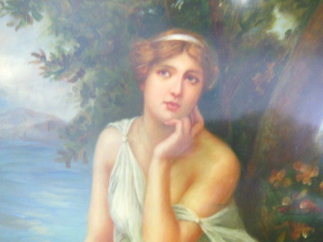 Depicitng a 'Beautiful Woman with a Scenic Background.' In gold leaf frame. Image approx. 15.5" H. X 11". Framed approx. 22.5" H. X 18".