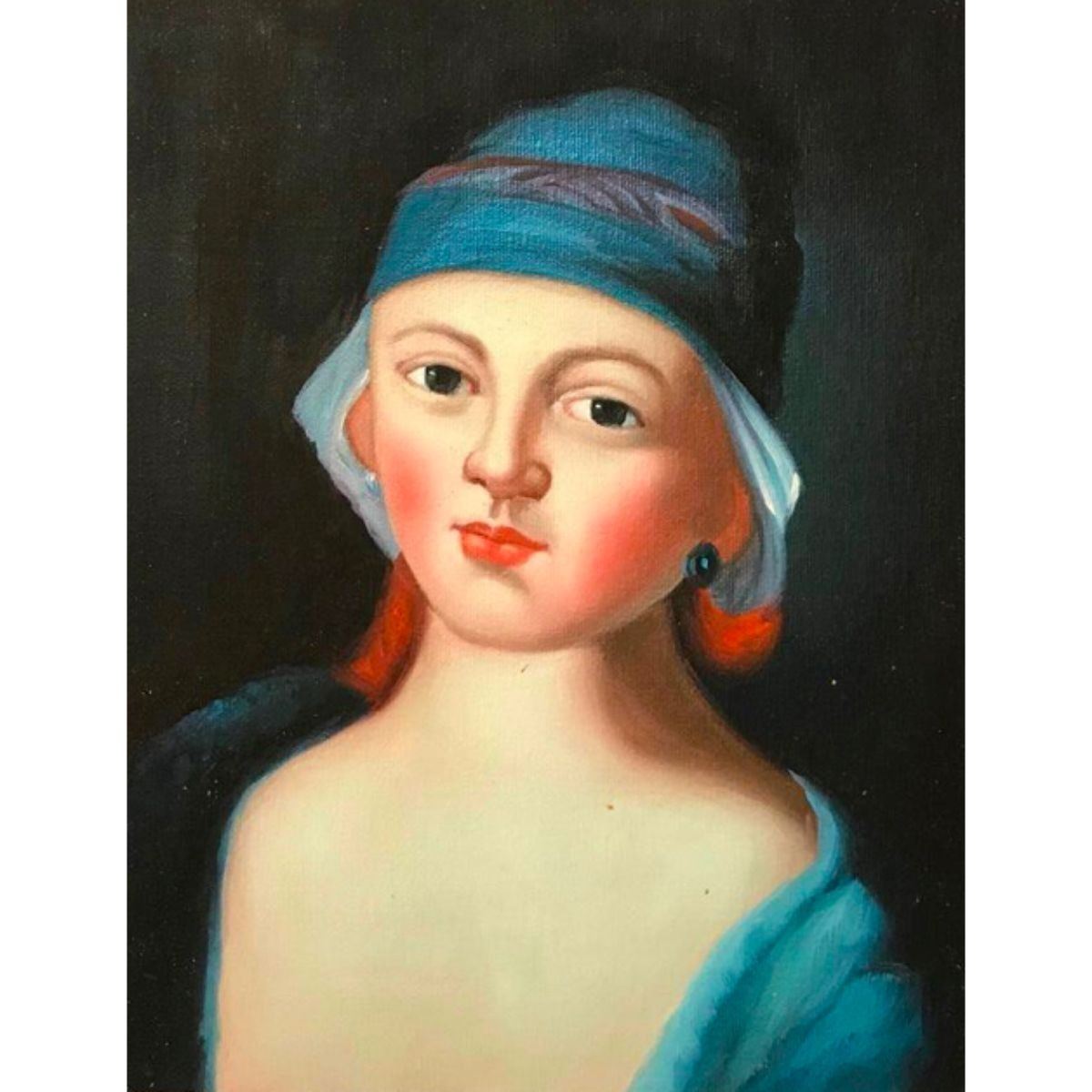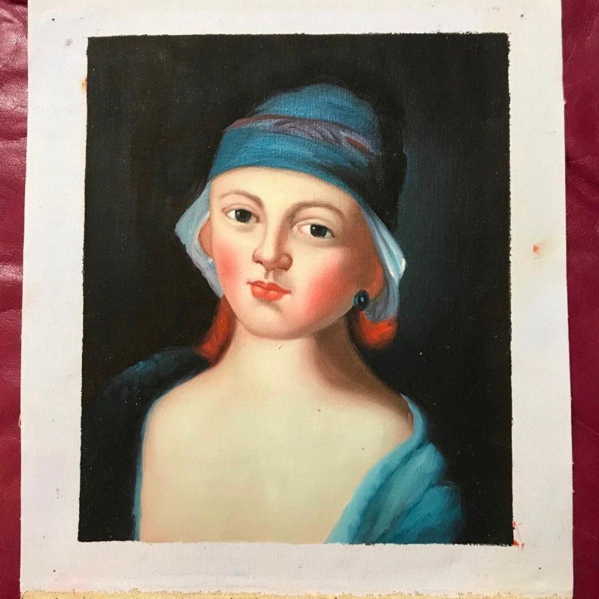 20th-century oil on canvas painting of a woman wearing a blue hat. Un-stretched canvas. 8 1/2" X 10 1/4"