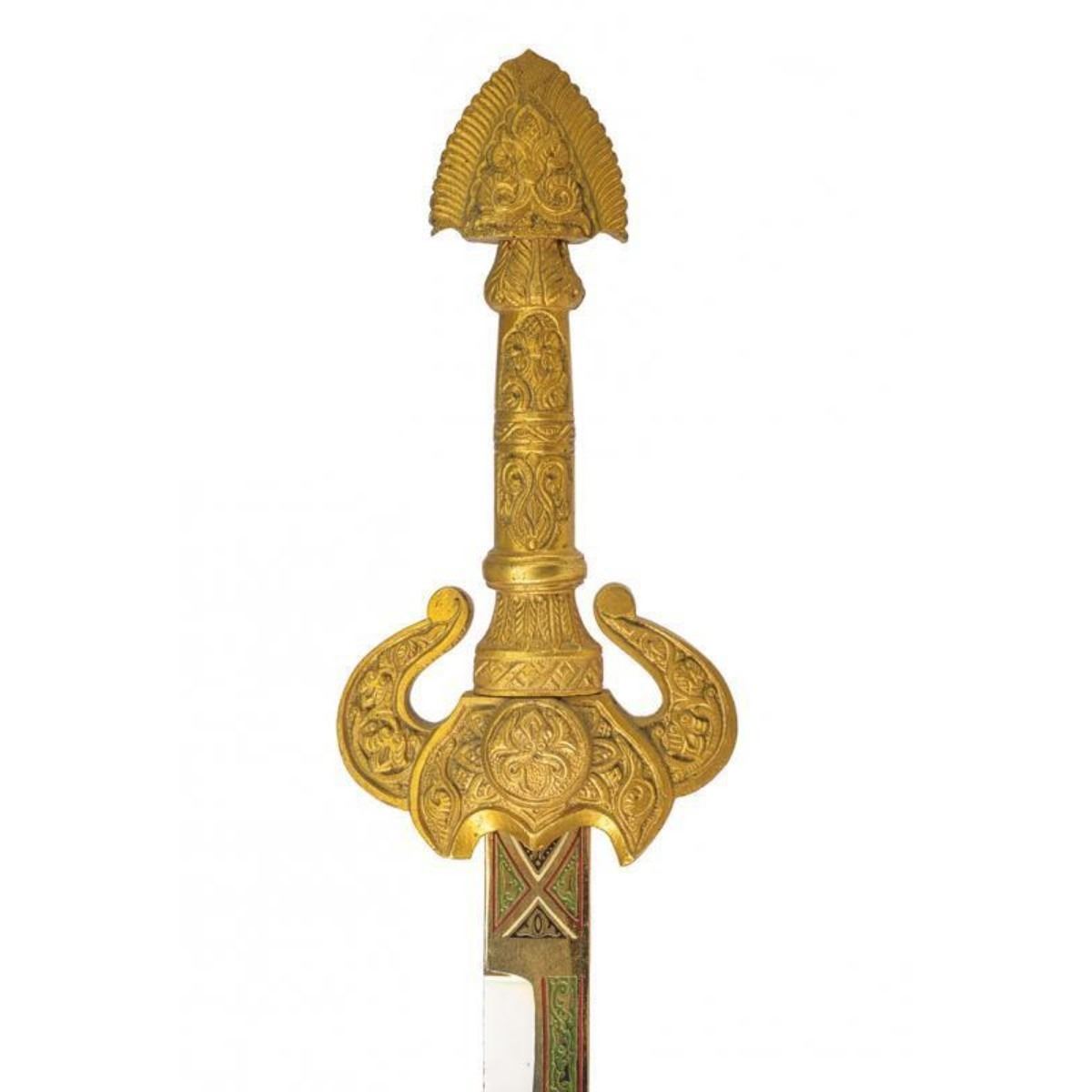20thc Toledo dagger, the blade very curved to a thread & counter-thread decorated, with colored engravings with floral & geometric motifs, marked "TOLEDO"; massive brass handle engraved with floral motifs; brass scabbard decorated en suite with the blade & handle.  18 1/2"L (47cm ). 10119-040518-CZ-01053