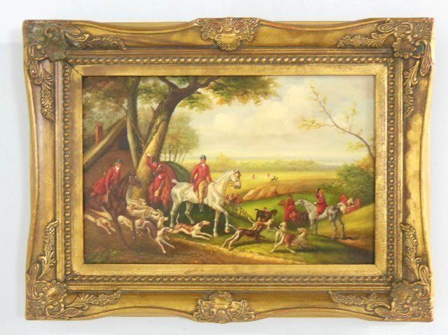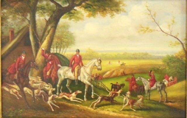 Depicting 'Hunting Scene with Horses and Dogs.' Approx. 12" X 18". Framed approx. 17" X 23".