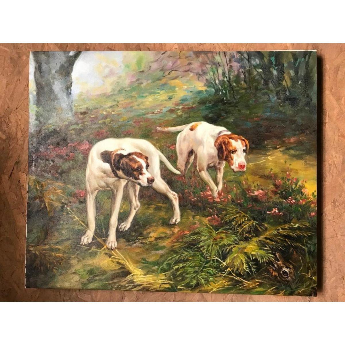 20th Century oil on canvas painting of a pair of Hunting Dogs. Unframed stretched canvas, unsigned. 20" X 24".Â