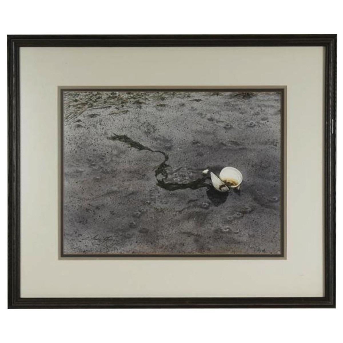 Rare original watercolor on paper painting, by listed artist Carol Stecher-Jones ( Northwest Washington ) Beach scene with shell & seaweed. Titled "Low Tide". Signed at bottom & dated 1982. Framed 24" X 28 1/2"