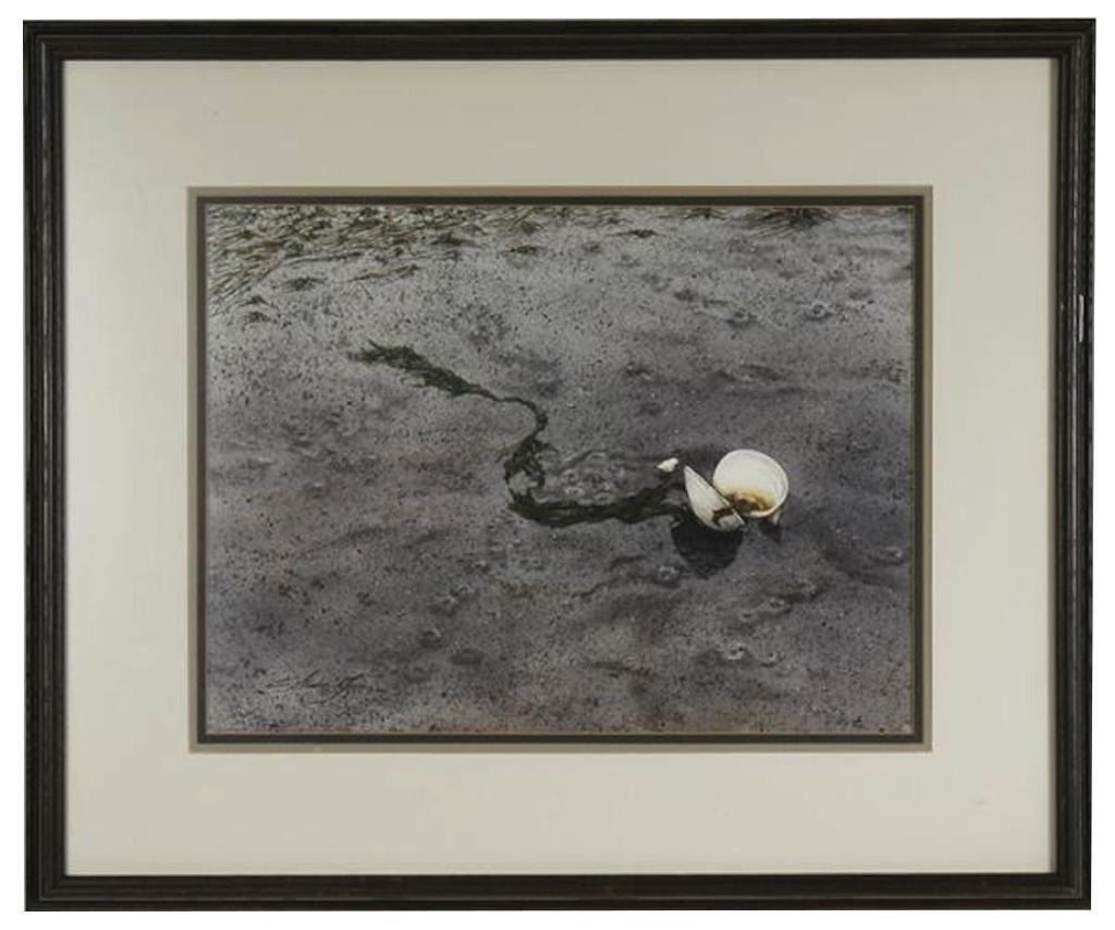 Rare original watercolor on paper painting, by listed artist Carol Stecher-Jones ( Northwest Washington ) Beach scene with shell & seaweed. Titled "Low Tide". Signed at bottom & dated 1982. Framed 24" X 28 1/2"