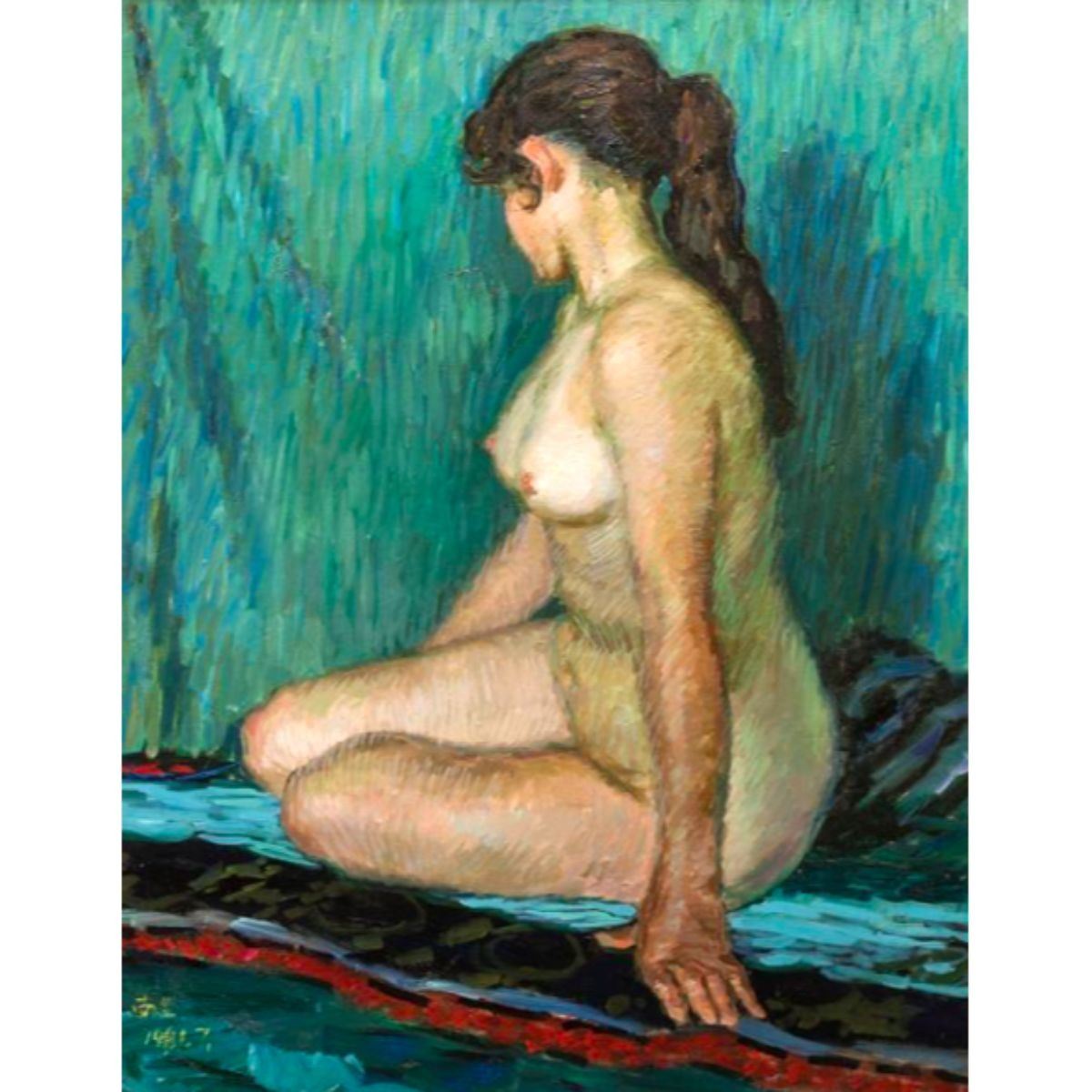 Late 20th century Japanese signed oil on canvas Impressionist painting depicting a seated female nude gazing towards the back wall, rendered in a heavy impasto technique. Signed with Japanese characters and dated "1981.7." lower left. Housed in a carved black & giltwood frame with tan wood rabbet edge. Sight - 30 3/8" H x 23 3/4" W. Framed - 37 3/4" H x 31 1/4" W. Late 20th century - 9130-012718-IN-00601