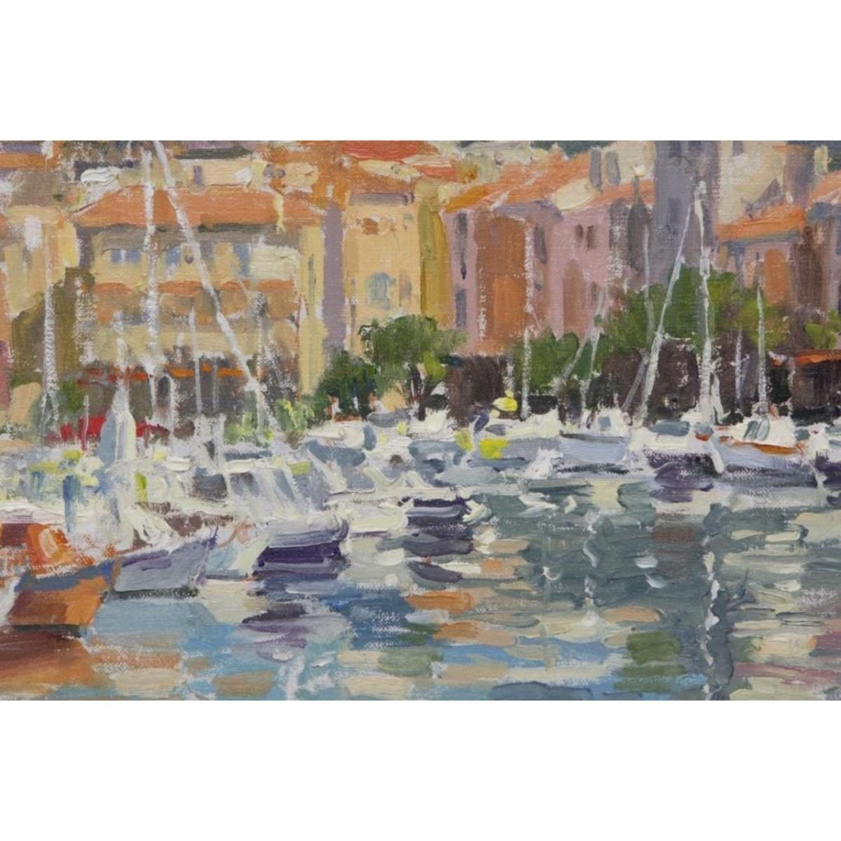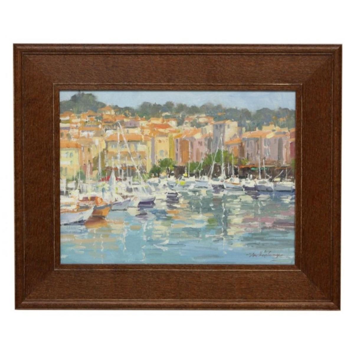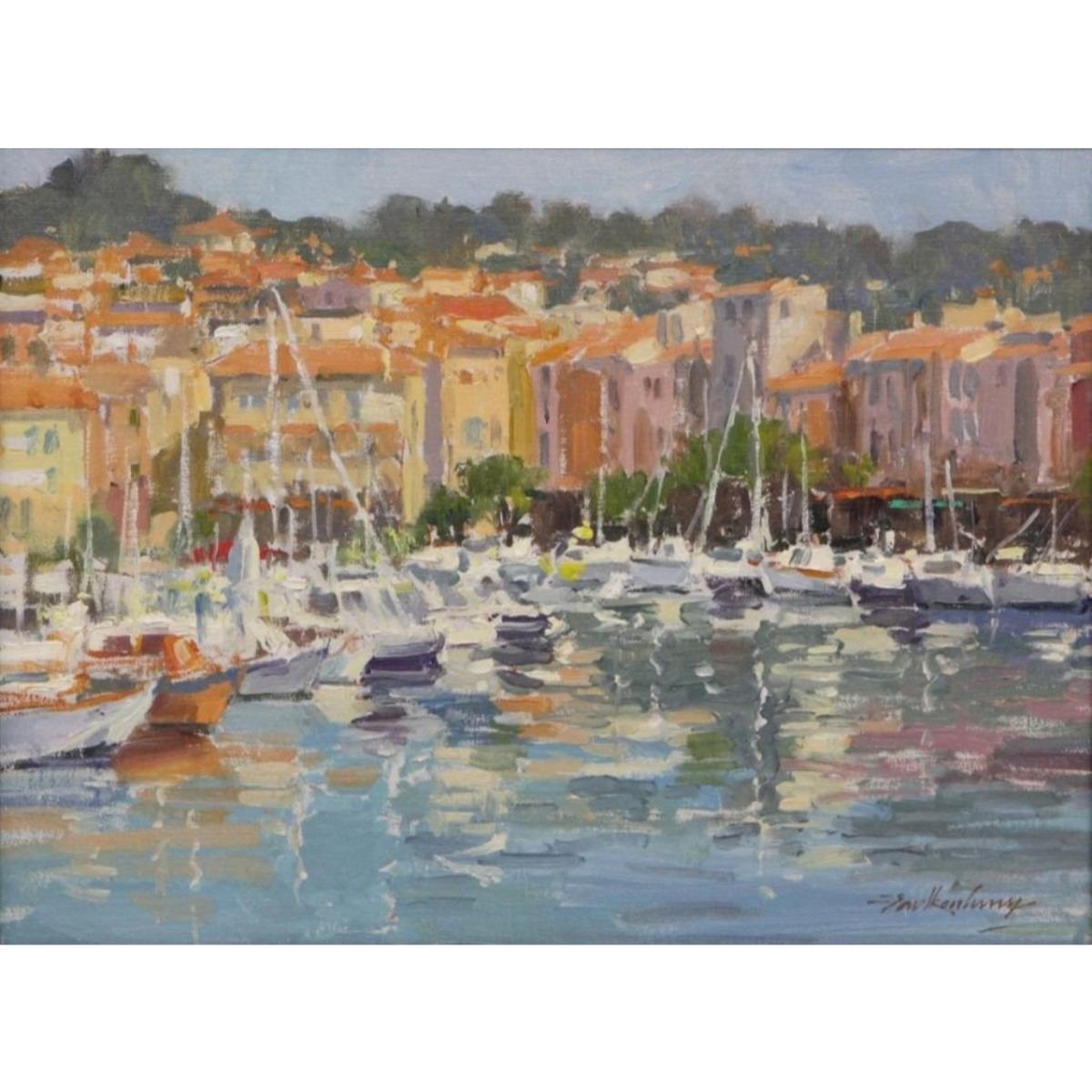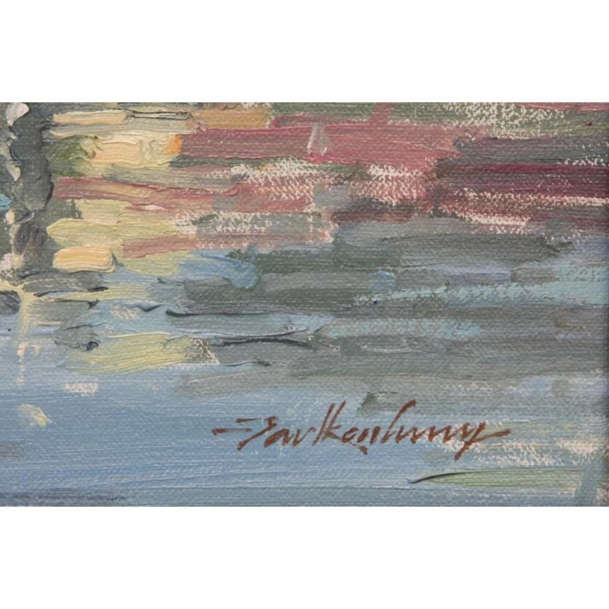 Signed Falkenberry ( Gay Faulkenberry, Oklahoma, New Mexico, b 1952 ) framed oil painting on board, "Harbor Houses & Boats. Signed lower right. 17 1/2" X 21 1/2".