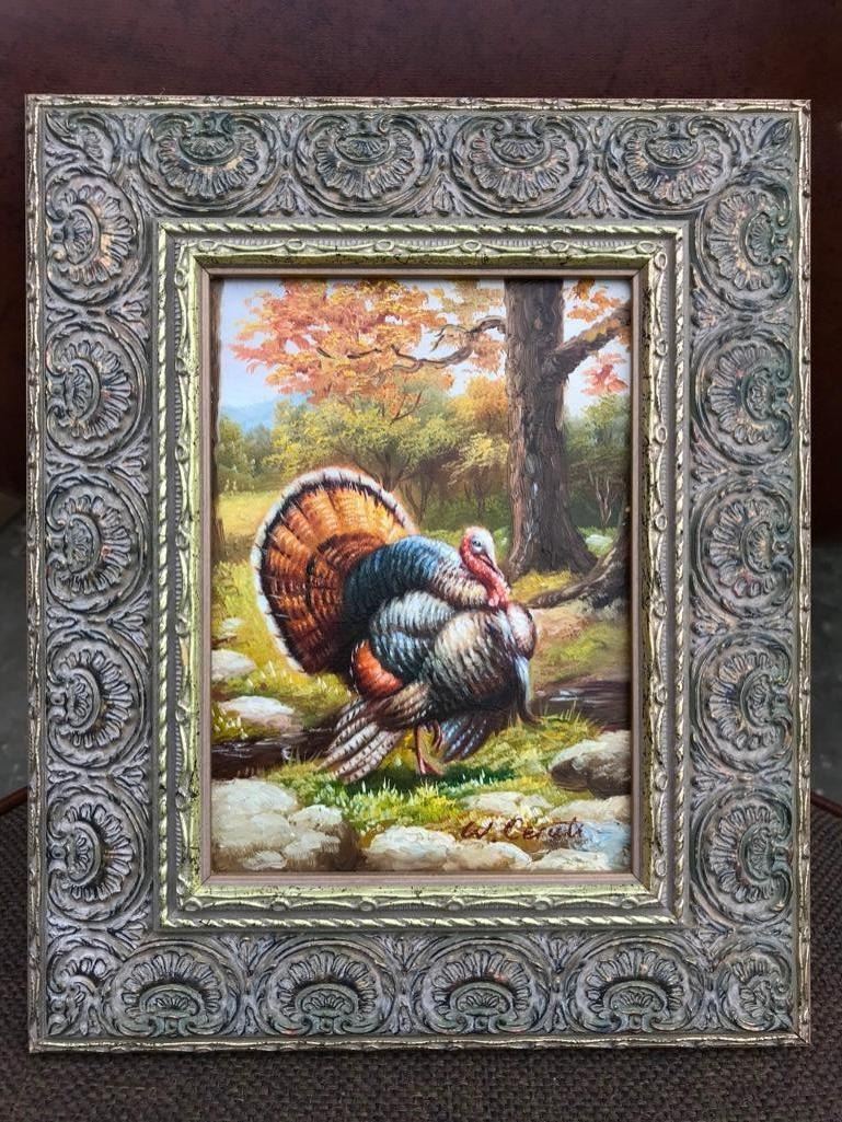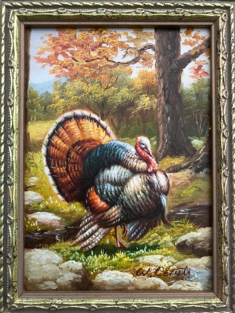 20th Century oil painting, hunt scene, depicting a wild turkey gobbler in landscape. 5" X 7" oil on board in 8" X 10" ornate gold gilt frame. Signed W. Ceruti, lower right corner.Â