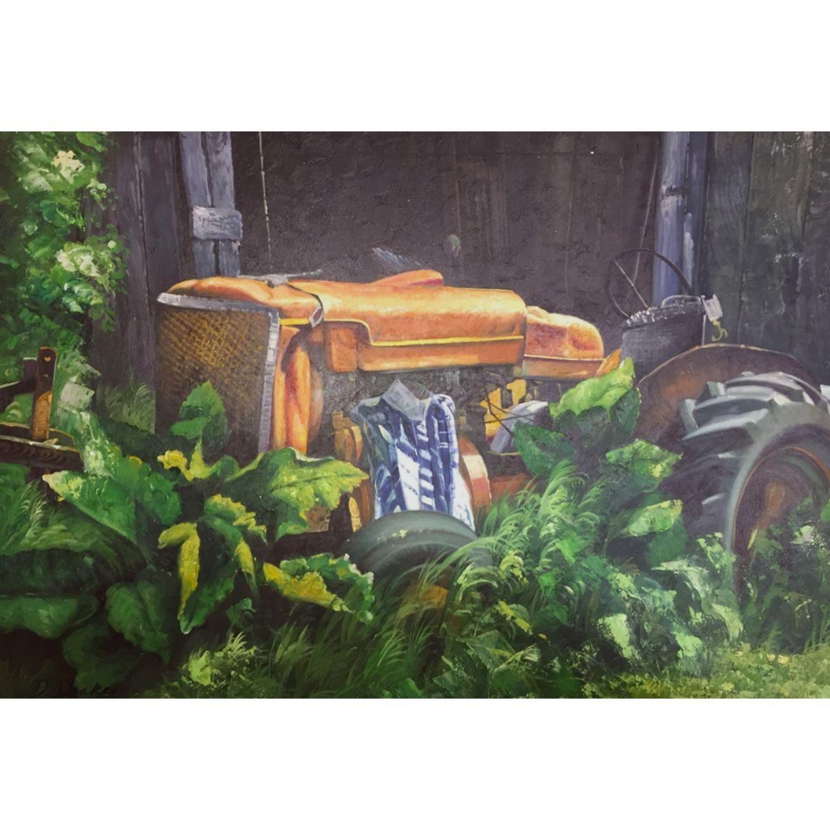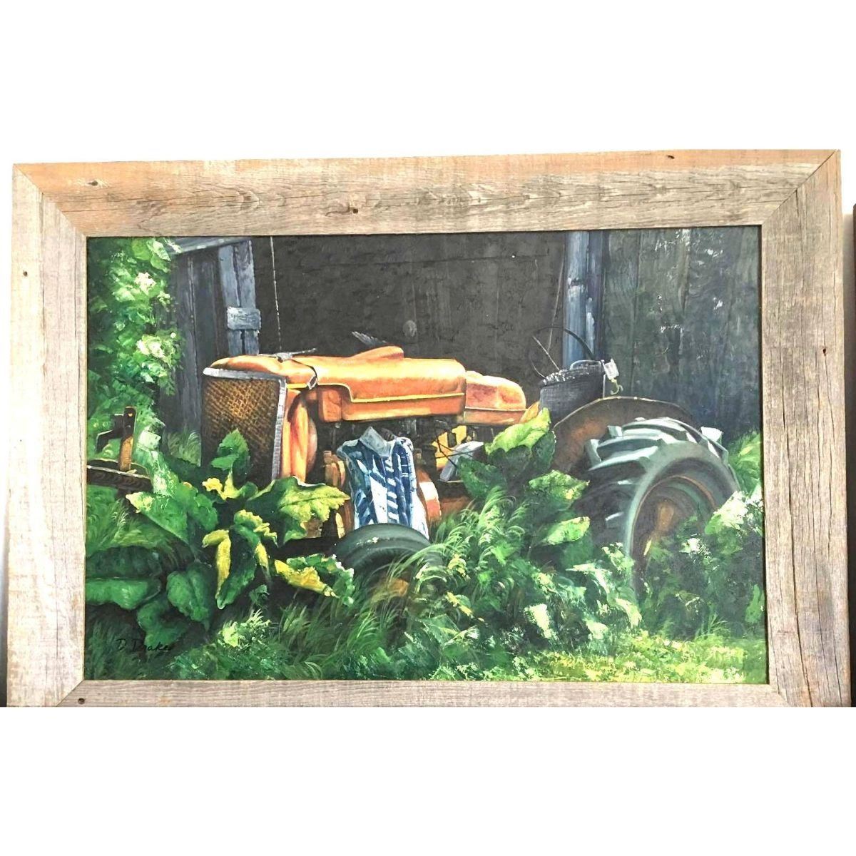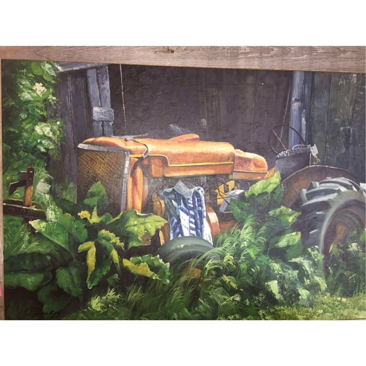 20th Century oil on canvas painting, "Pappaw's Tractor" signed lower left "D Drake". Rural scene of an old tractor rusting away next to a barn. 24" X 36" framed in handcrafted old re-purposed barn board wood frame. Â