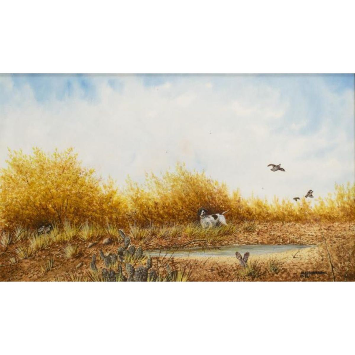 Quail & Pointer hunting theme watercolor on paper painting. In a gilt frame. Dated 1980 & and signed lower right Maldonado ( Daniel Maldonado, Texas, 20th/21st c.), 13" H X 22" W. Overall 20 1/2" H X 29 1/2" W. 7.75lbs. - 9222-021718-IN-134