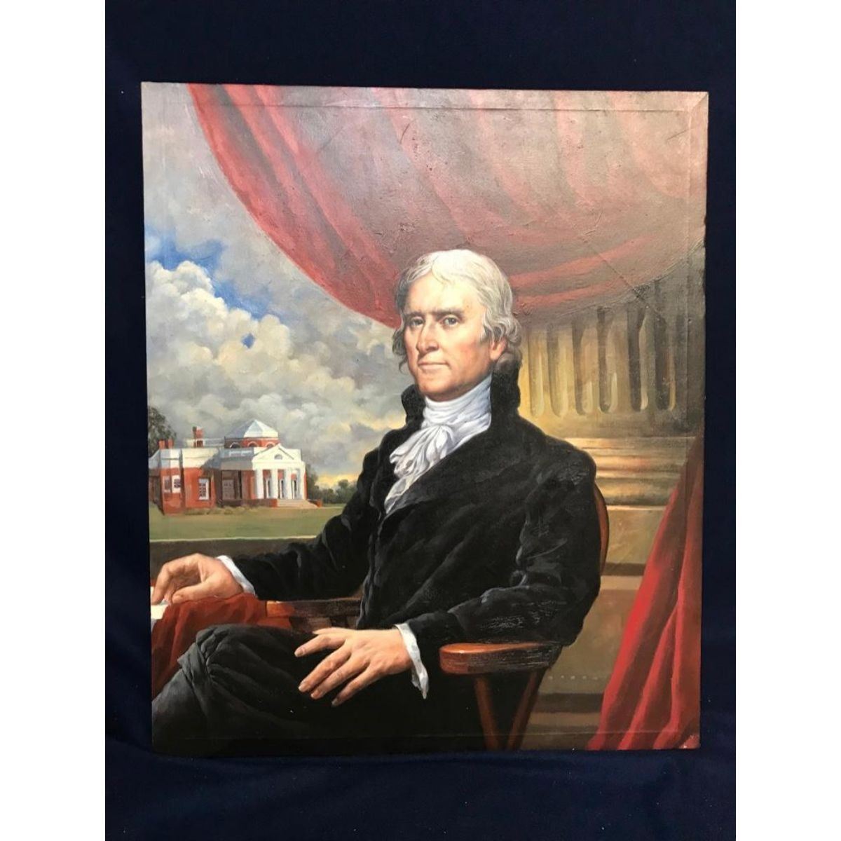 20th Century study, oil on canvas painting of Thomas Jefferson seated in front of his home, Montecello, in Virginia. Created by an artist with The School of Bianco in the 1990's. 20" X 24" on stretched canvas. Unsigned. *** stretcher bars have created impressed marks along the edges of this painting, from storage, as shown in photos. ** this is an oil painting & not a giclee or print attached to canvas.