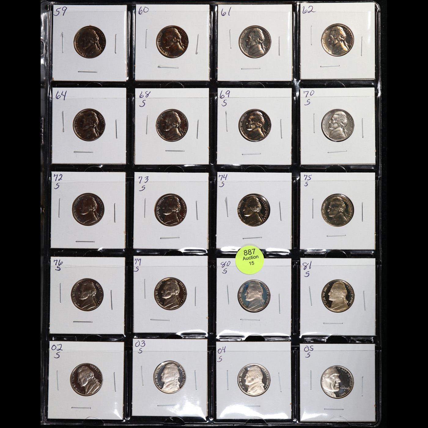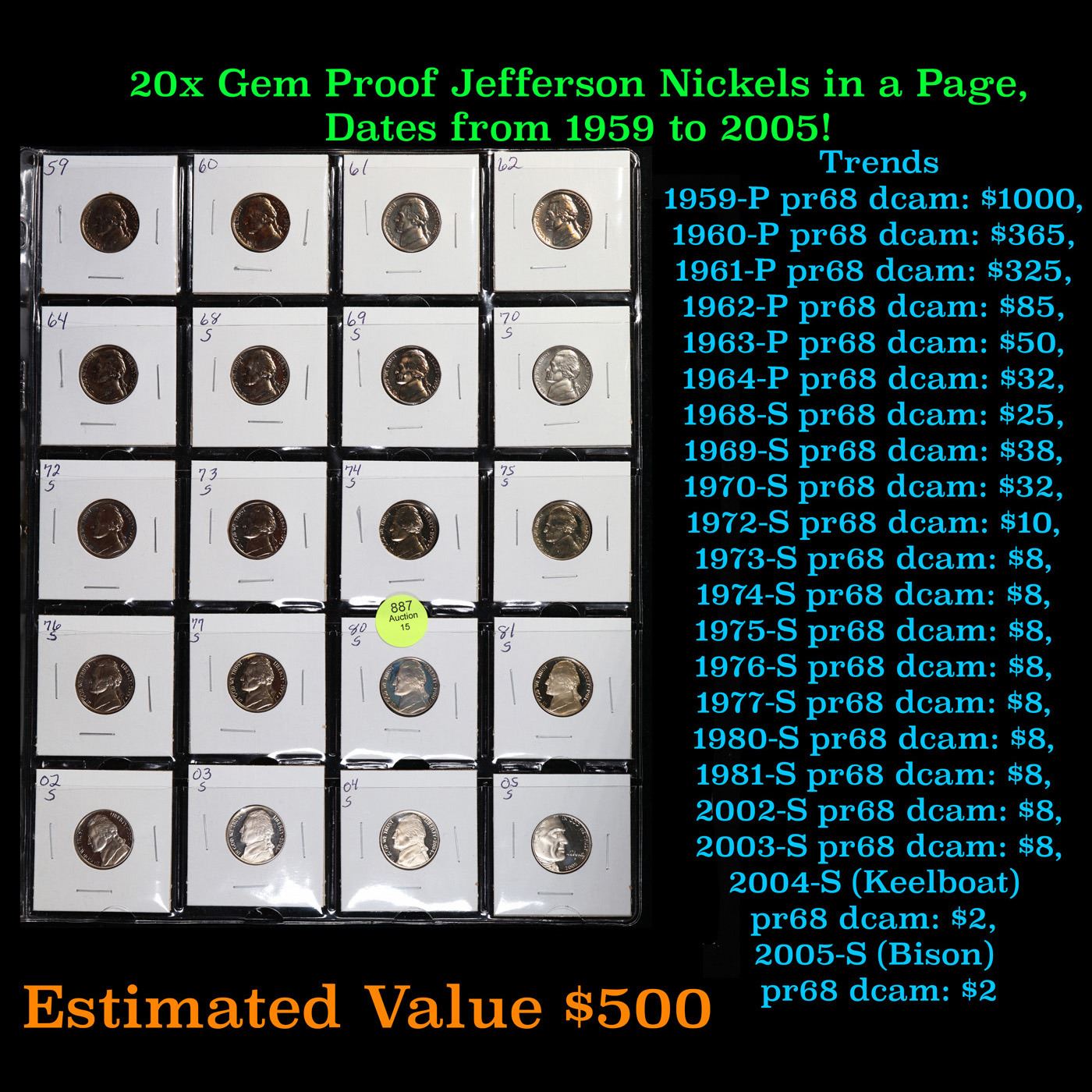 20x Proof Jefferson Nickels in a Page, Dates from 1959 to 2005! Jefferson Nickel 5c Grades Brilliant Uncirculated. Up for sale is a page of 20 Proof Jefferson Nickels of the following varieties and trending values: 1959-P pr68 dcam: $1000, 1960-P pr68 dcam: $365, 1961-P pr68 dcam: $325, 1962-P pr68 dcam: $85, 1963-P pr68 dcam: $50, 1964-P pr68 dcam: $32, 1968-S pr68 dcam: $25, 1969-S pr68 dcam: $38, 1970-S pr68 dcam: $32, 1972-S pr68 dcam: $10, 1973-S pr68 dcam: $8, 1974-S pr68 dcam: $8, 1975-S pr68 dcam: $8, 1976-S pr68 dcam: $8, 1977-S pr68 dcam: $8, 1980-S pr68 dcam: $8, 1981-S pr68 dcam: $8, 2002-S pr68 dcam: $8, 2003-S pr68 dcam: $8, 2004-S (Boat or Louisiana) pr68 dcam: $2, 2005-S (Bison) pr68 dcam: $2
