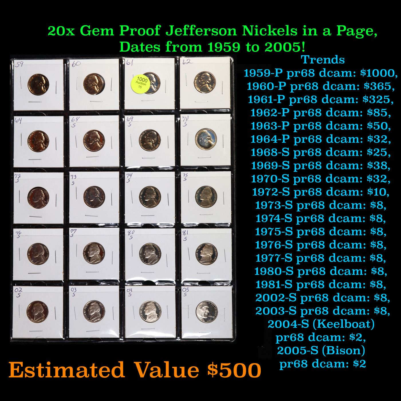 20x Proof Jefferson Nickels in a Page, Dates from 1959 to 2005! Jefferson Nickel 5c Grades Brilliant Uncirculated. Up for sale is a page of 20 Proof Jefferson Nickels of the following varieties and trending values: 1959-P pr68 dcam: $1000, 1960-P pr68 dcam: $365, 1961-P pr68 dcam: $325, 1962-P pr68 dcam: $85, 1963-P pr68 dcam: $50, 1964-P pr68 dcam: $32, 1968-S pr68 dcam: $25, 1969-S pr68 dcam: $38, 1970-S pr68 dcam: $32, 1972-S pr68 dcam: $10, 1973-S pr68 dcam: $8, 1974-S pr68 dcam: $8, 1975-S pr68 dcam: $8, 1976-S pr68 dcam: $8, 1977-S pr68 dcam: $8, 1980-S pr68 dcam: $8, 1981-S pr68 dcam: $8, 2002-S pr68 dcam: $8, 2003-S pr68 dcam: $8, 2004-S (Boat or Louisiana) pr68 dcam: $2, 2005-S (Bison) pr68 dcam: $2