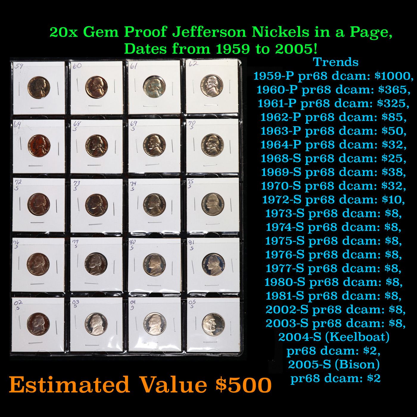 20x Proof Jefferson Nickels in a Page, Dates from 1959 to 2005! Jefferson Nickel 5c Grades Brilliant Uncirculated. Up for sale is a page of 20 Proof Jefferson Nickels of the following varieties and trending values: 1959-P pr68 dcam: $1000, 1960-P pr68 dcam: $365, 1961-P pr68 dcam: $325, 1962-P pr68 dcam: $85, 1963-P pr68 dcam: $50, 1964-P pr68 dcam: $32, 1968-S pr68 dcam: $25, 1969-S pr68 dcam: $38, 1970-S pr68 dcam: $32, 1972-S pr68 dcam: $10, 1973-S pr68 dcam: $8, 1974-S pr68 dcam: $8, 1975-S pr68 dcam: $8, 1976-S pr68 dcam: $8, 1977-S pr68 dcam: $8, 1980-S pr68 dcam: $8, 1981-S pr68 dcam: $8, 2002-S pr68 dcam: $8, 2003-S pr68 dcam: $8, 2004-S (Boat or Louisiana) pr68 dcam: $2, 2005-S (Bison) pr68 dcam: $2