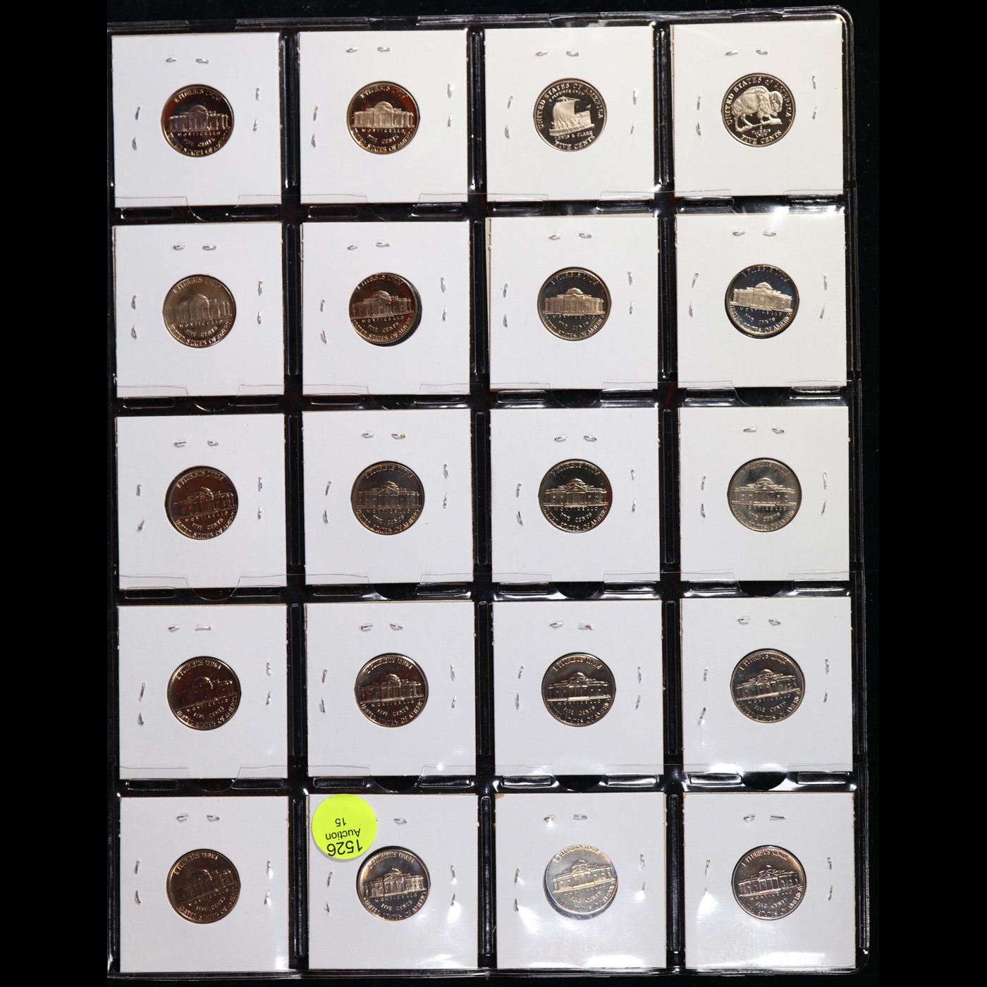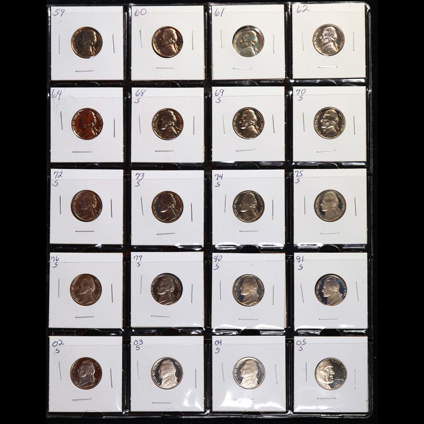 20x Proof Jefferson Nickels in a Page, Dates from 1959 to 2005! Jefferson Nickel 5c Grades Brilliant