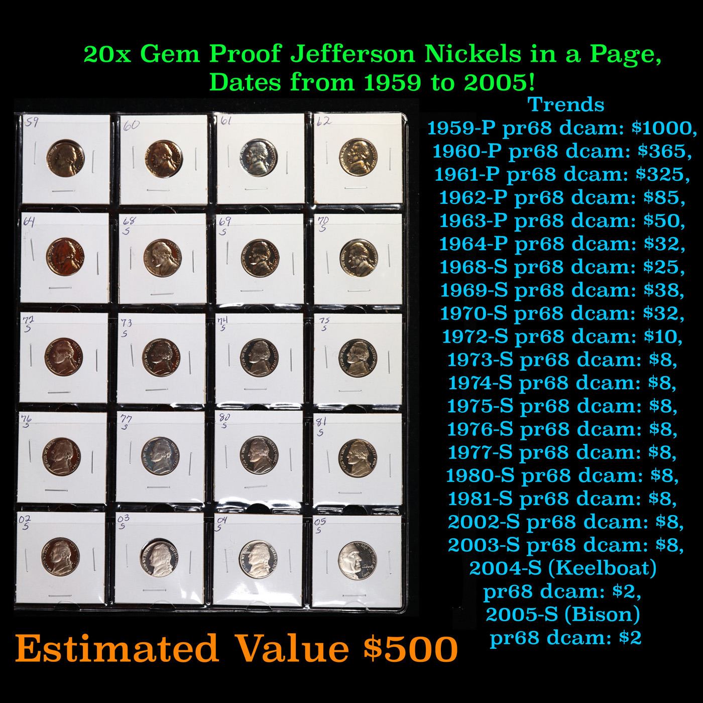 20x Proof Jefferson Nickels in a Page, Dates from 1959 to 2005! Jefferson Nickel 5c Grades Brilliant Uncirculated. Up for sale is a page of 20 Proof Jefferson Nickels of the following varieties and trending values: 1959-P pr68 dcam: $1000, 1960-P pr68 dcam: $365, 1961-P pr68 dcam: $325, 1962-P pr68 dcam: $85, 1963-P pr68 dcam: $50, 1964-P pr68 dcam: $32, 1968-S pr68 dcam: $25, 1969-S pr68 dcam: $38, 1970-S pr68 dcam: $32, 1972-S pr68 dcam: $10, 1973-S pr68 dcam: $8, 1974-S pr68 dcam: $8, 1975-S pr68 dcam: $8, 1976-S pr68 dcam: $8, 1977-S pr68 dcam: $8, 1980-S pr68 dcam: $8, 1981-S pr68 dcam: $8, 2002-S pr68 dcam: $8, 2003-S pr68 dcam: $8, 2004-S (Boat or Louisiana) pr68 dcam: $2, 2005-S (Bison) pr68 dcam: $2