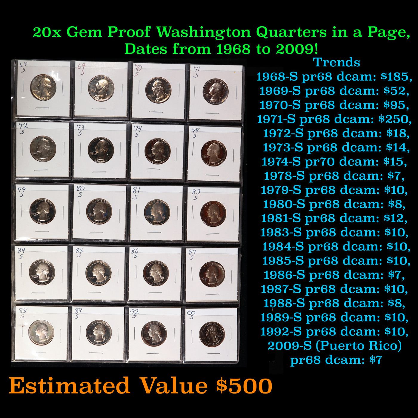 20x Proof Washington Quarters in a Page, Dates from 1968 to 2009! Washington Quarter 25c Grades Brilliant Uncirculated. Up for sale is a page of 20 Proof Jefferson Nickels of the following varieties and trending values: 1968-S pr68 dcam: $185, 1969-S pr68 dcam: $52, 1970-S pr68 dcam: $95, 1971-S pr68 dcam: $250, 1972-S pr68 dcam: $18, 1973-S pr68 dcam: $14, 1974-S pr70 dcam: $15, 1978-S pr68 dcam: $7, 1979-S pr68 dcam: $10, 1980-S pr68 dcam: $8, 1981-S pr68 dcam: $12, 1983-S pr68 dcam: $10, 1984-S pr68 dcam: $10, 1985-S pr68 dcam: $10, 1986-S pr68 dcam: $7, 1987-S pr68 dcam: $10, 1988-S pr68 dcam: $8, 1989-S pr68 dcam: $10, 1992-S pr68 dcam: $10, 2000-S (Maryland) pr68 dcam: $8